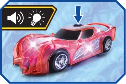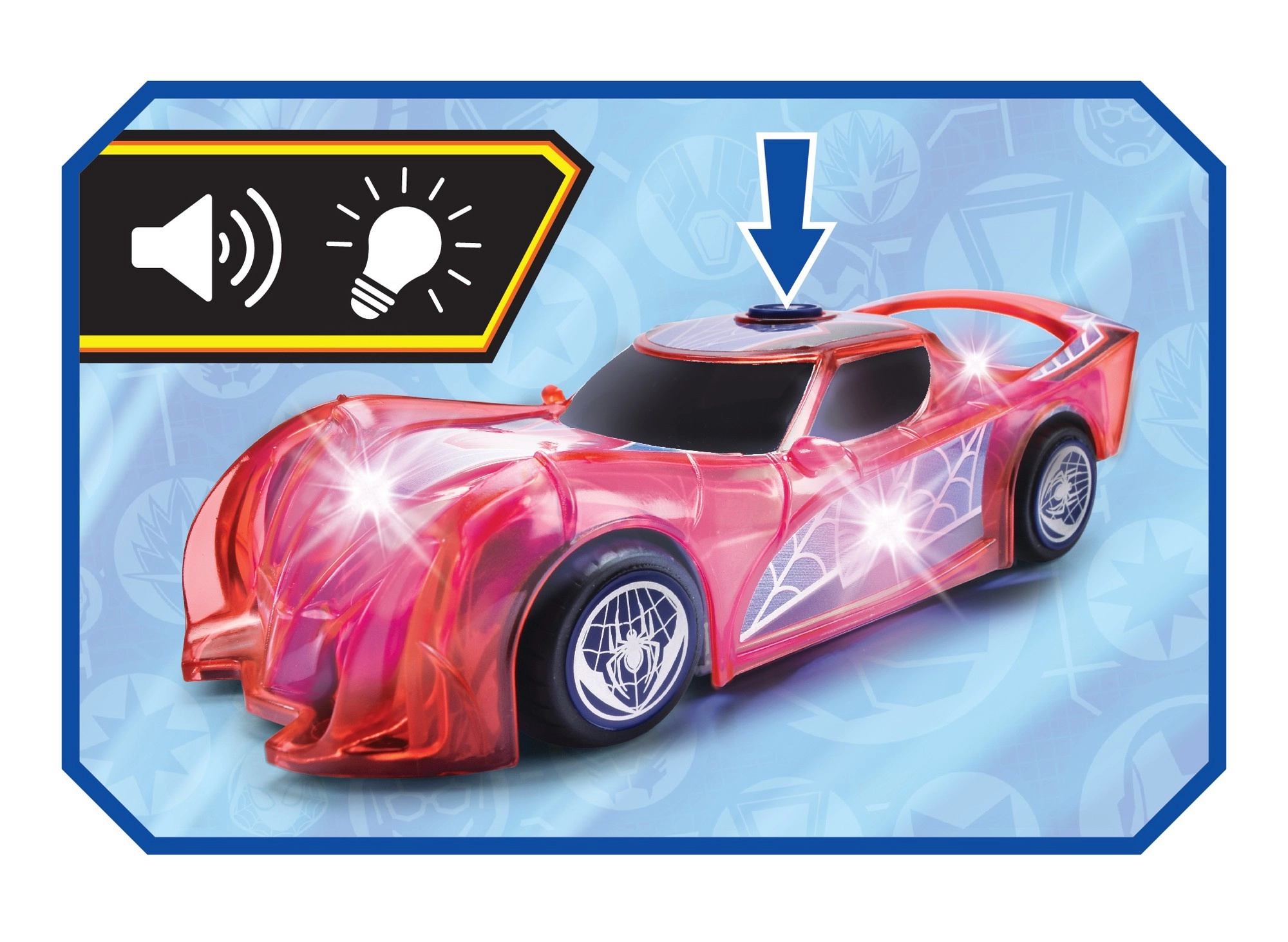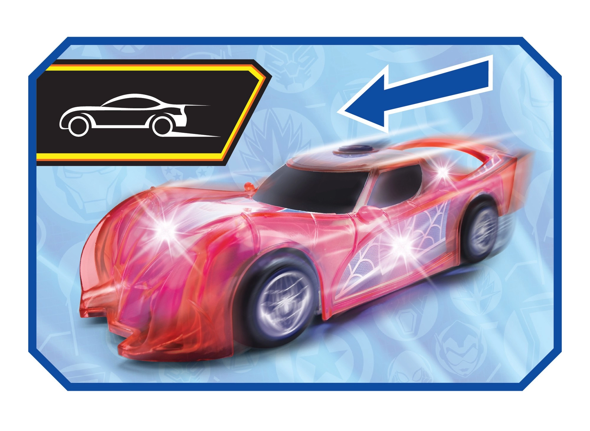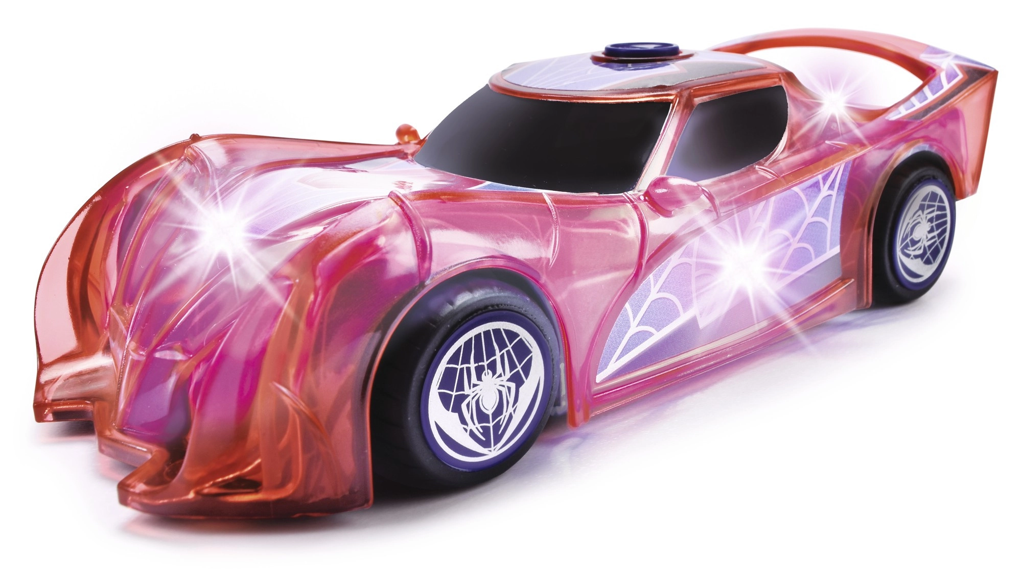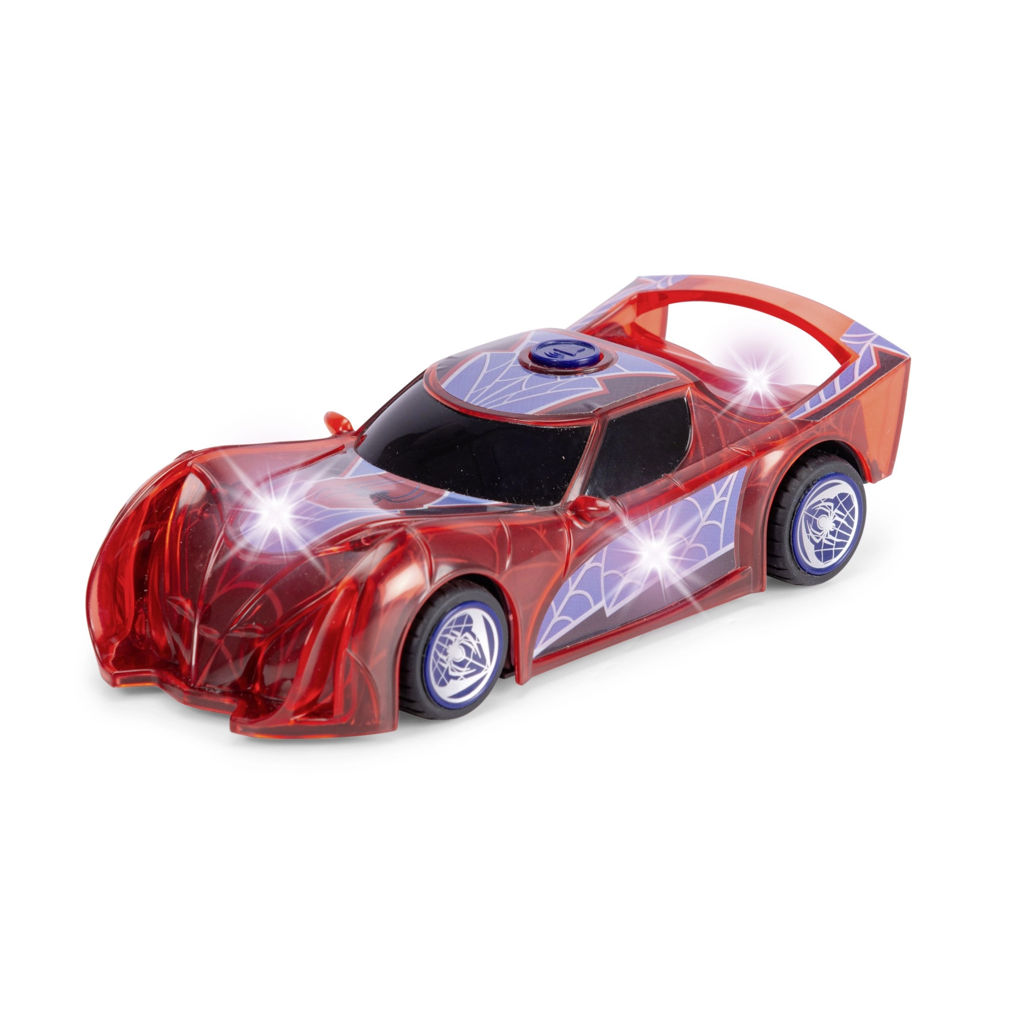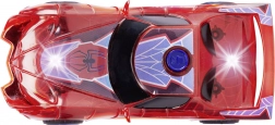 Superbohaterskie auto SPIDER‑MAN w charakterystycznym czerwonym kolorze i z pajęczynowymi detalami wyróżnia się półprzezroczystym designem oraz wbudowanymi światłami LED, które rozświetlą każdą przygodę. Prosty mechanizm push‑and‑go (napęd cierny) – wystarczy lekko popchnąć, a auto ruszy do przodu.