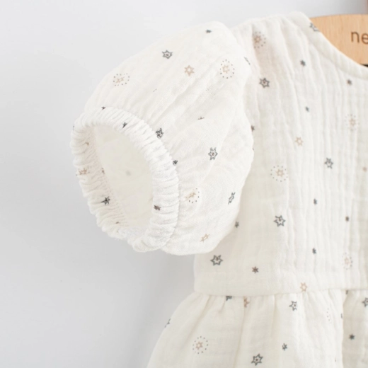 Leciutka muślinowa sukienka New Baby Zora dla niemowląt zachwyca wygodą i stylem. Ma krótkie rękawy, krój w kształcie litery A oraz delikatnie marszczoną spódniczkę. Praktyczne zapięcie na guziki z przodu ułatwia ubieranie. Wykonana z przyjemnego, mięciutkiego muślinu ze 100% bawełny, idealnego na lato. Oddychający materiał pomaga zapobiegać przegrzaniu i jest łagodny dla wrażliwej skóry dziecka.