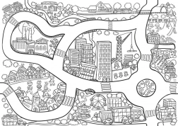 Kolorujcie wspólnie z dziećmi przy dużym formacie, który łatwo rozłożyć na stole lub podłodze. Jeśli zbierzesz wszystkie sześć motywów, z łatwością połączysz je w jedną dużą mapę połączoną drogą – idealną jako dekoracja pokoju dziecięcego.