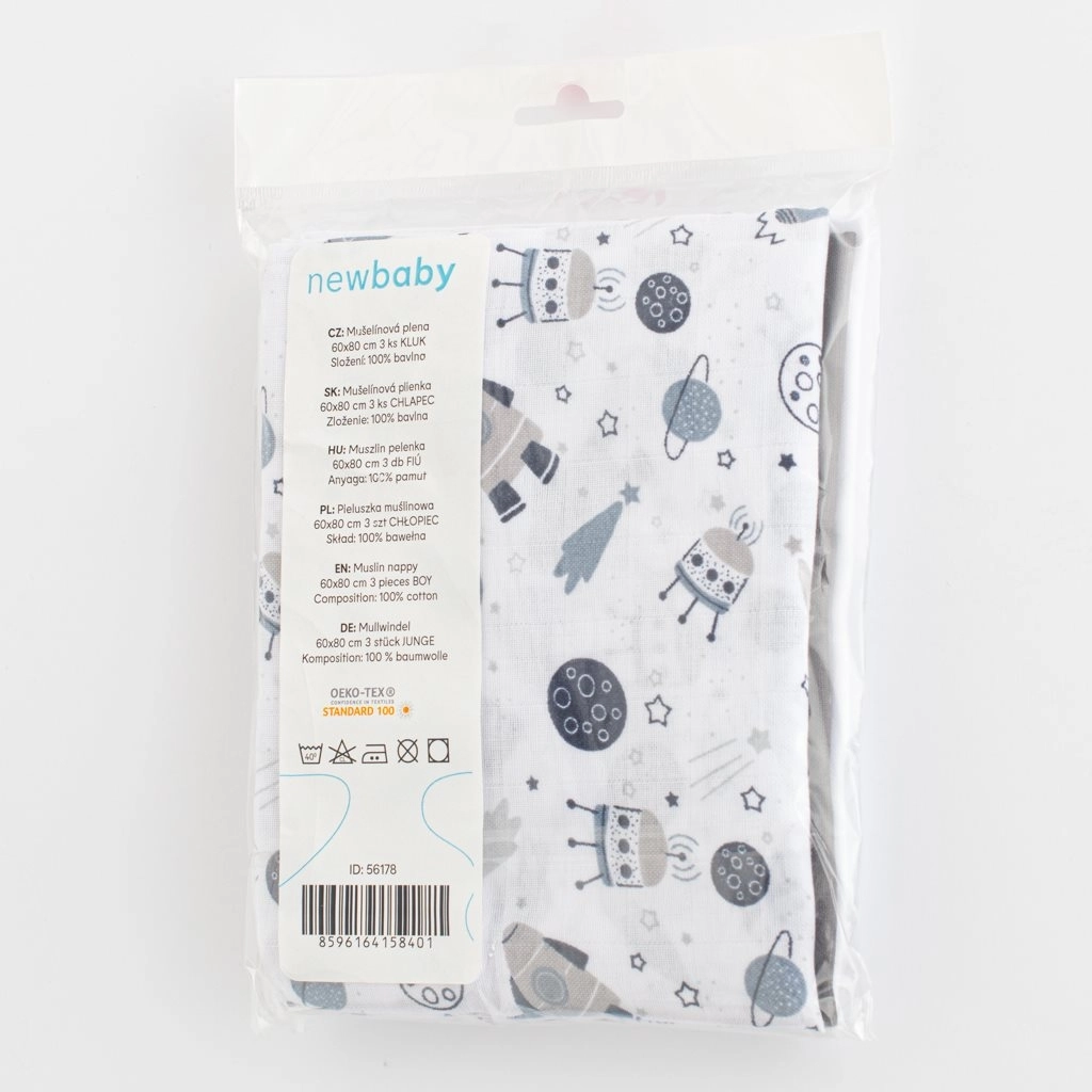 Pieluszki są wielofunkcyjne – sprawdzą się jako ręczniki, podkłady, otulacze lub lekki kocyk do wózka czy łóżeczka. W zestawie znajdziesz dwie jednokolorowe i jedną z uroczym nadrukiem w kolorach odpowiednich dla chłopców.