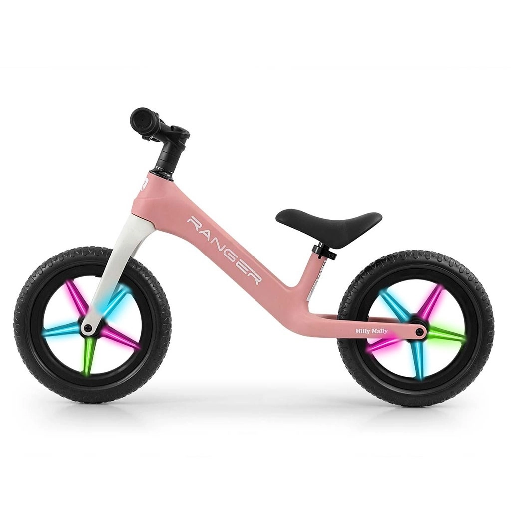 Lekki rowerek biegowy MILLY MALLY Ranger Flash w kolorze różowym pomaga dzieciom rozwijać równowagę i koordynację przed przejściem na rower z pedałami. Oferuje kompozytową ramę, bezobsługowe koła 12″ z pianki EVA oraz regulowaną wysokość siodełka dla wygody i wraz ze wzrostem dziecka. Łożyskowana kierownica i koła, miękkie, antypoślizgowe chwyty oraz podświetlane diodami LED szprychy obręczy zwiększają bezpieczeństwo i frajdę z jazdy.