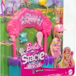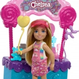 Stoisko jest pełne kolorowych detali: różowe słupki z lizakami, kasa, powierzchnia ekspozycyjna i obrotowy stojak na tort. Lalka Chelsea nosi różową sukienkę z motywem tęczy i stylową czapkę z daszkiem, ma ruchome ramiona i potrafi „trzymać” wybrane akcesoria. Dzięki kompaktowym wymiarom zestaw świetnie sprawdzi się w domu i w podróży.