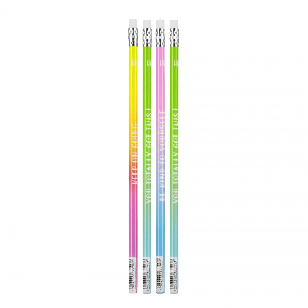 Odkryj kolorowe ołówki zintegrowane z gumką w nowoczesnym wzorze ombré, które przyciągają wzrok od pierwszego spojrzenia. Dzięki długości 19 cm dobrze leżą w dłoni i świetnie nadają się do pisania, rysowania oraz notatek w szkole czy biurze. Każdy ołówek ma na końcu gumkę do szybkiego i czystego mazania.