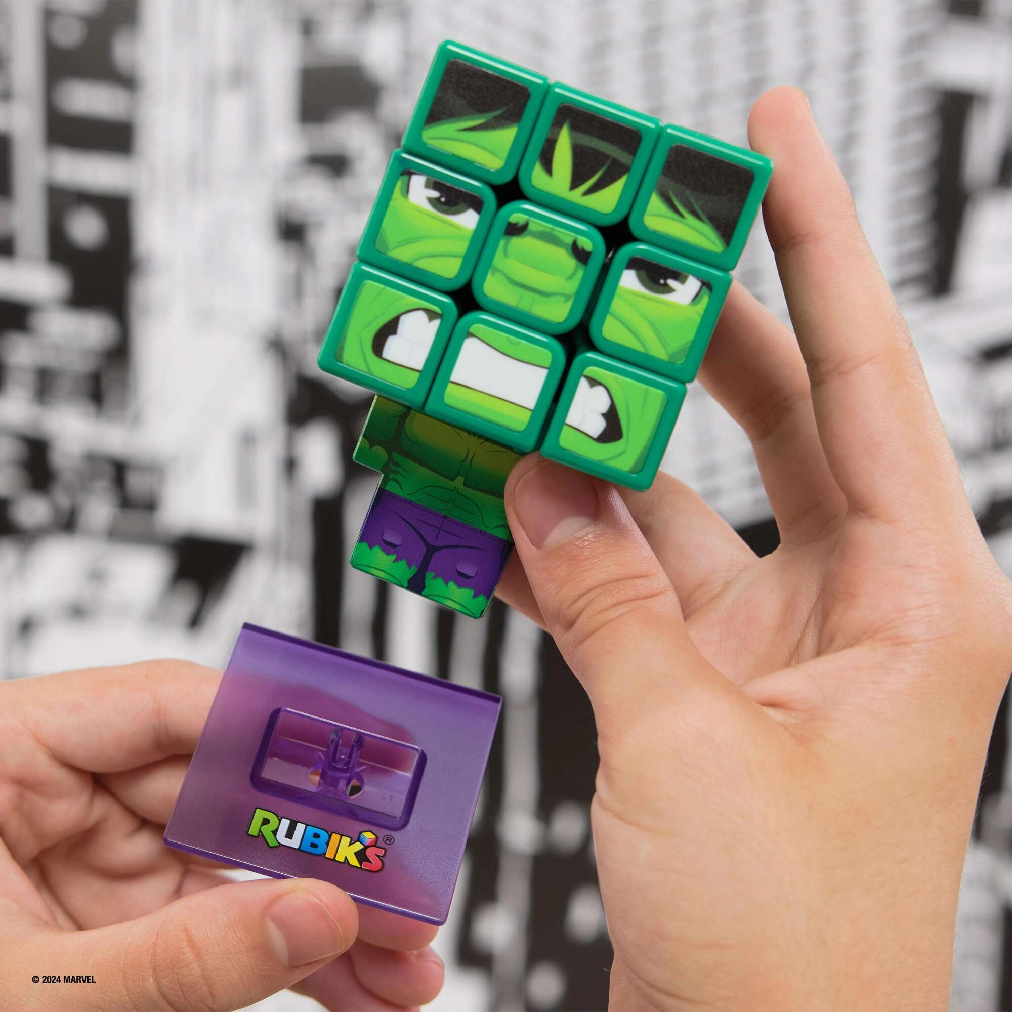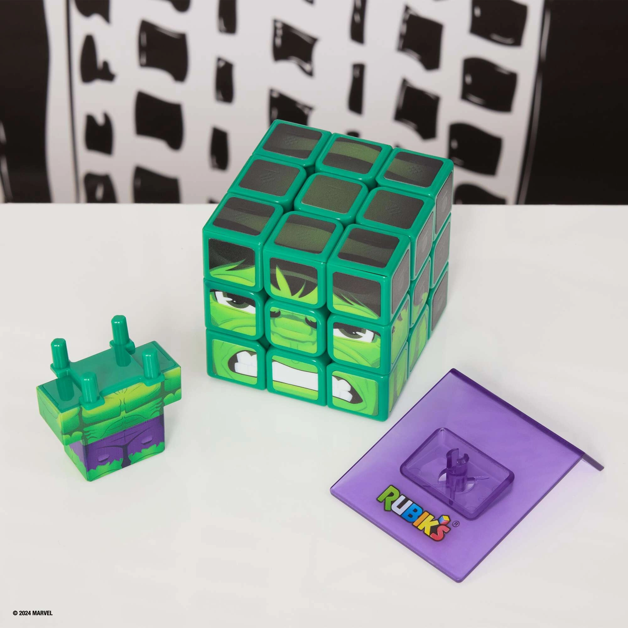 Ułóż twarz HULKA, zamocuj tułów i umieść na stojaku – kostka w mgnieniu oka zamieni się w kolekcjonerską dekorację.