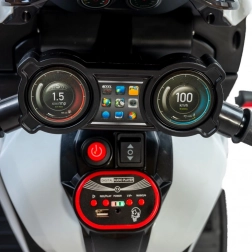 Motocykl wyposażono w reflektory LED dla atrakcyjnego wyglądu i lepszej widoczności, a także panel multimedialny z muzyką, piosenkami dla dzieci i funkcjami edukacyjnymi. Dzięki prostemu startowi jednym przyciskiem oraz przyciskowi jazdy do przodu/do tyłu poradzi sobie z nim nawet młodsze dziecko.