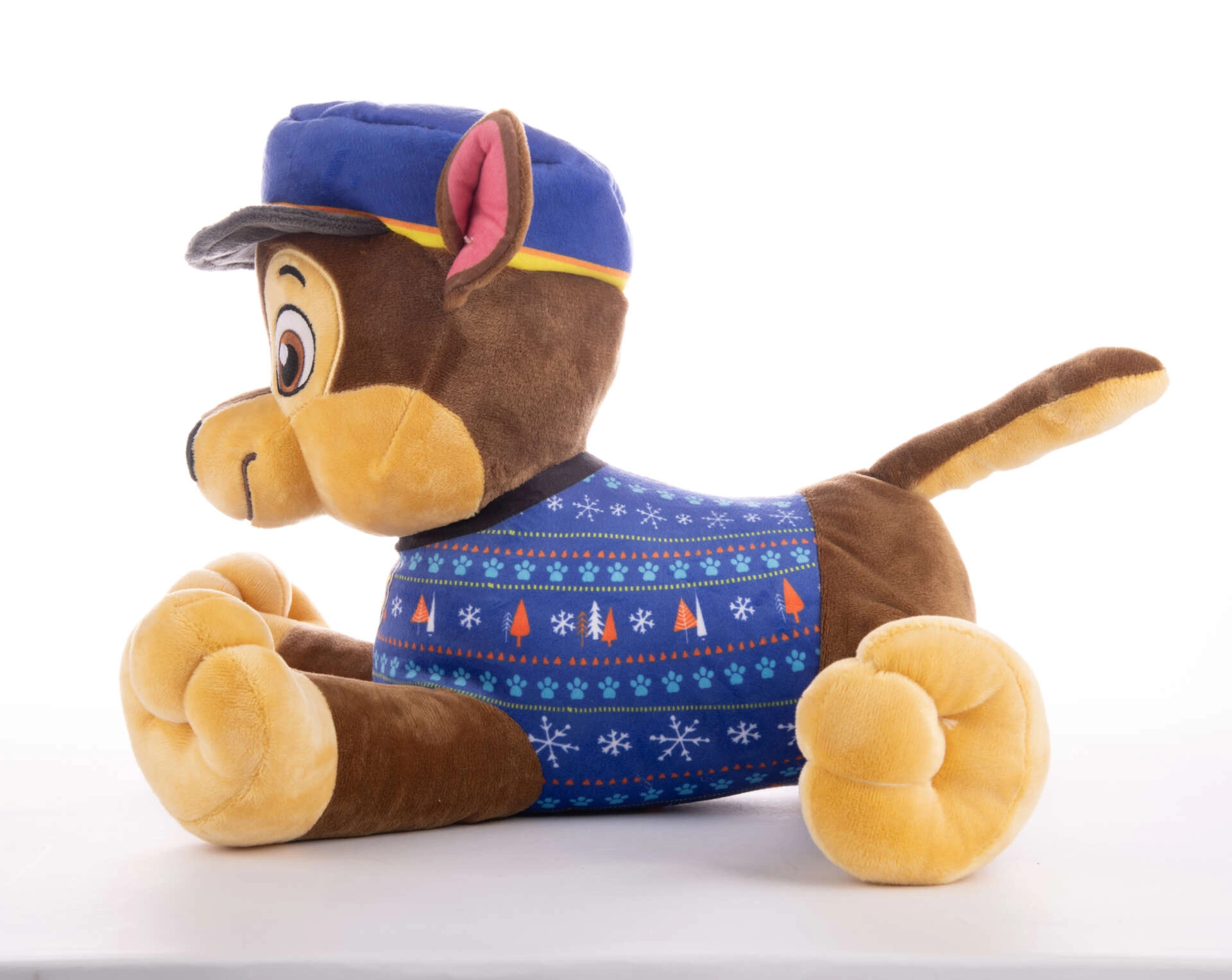 Pluszowy pies policjant Chase jest wiernie inspirowany serialem Psi Patrol. Dzięki dużym haftowanym oczom, niebieskiej policyjnej czapce i swetrowi z płatkami śniegu oraz choinkami wygląda maksymalnie autentycznie. Leżąca pozycja z wyciągniętymi łapkami czyni go idealnym partnerem do przytulania, spania i zabawy.