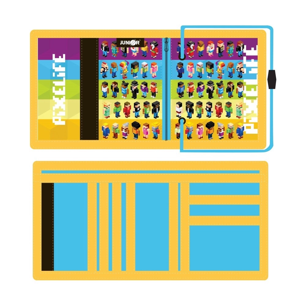 Praktyczny dziecięcy portfel Pixelife z wytrzymałego materiału tekstylnego oferuje przejrzysty układ i bezpieczne przechowywanie drobiazgów. Ma dużą przegrodę na banknoty, 6 mniejszych przegródek, przezroczystą kieszeń na legitymację oraz tylną kieszeń na zamek. W zestawie znajduje się smycz na szyję dla wygodnego noszenia.