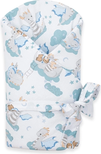 Rożek NEW BABY Smok wykonany jest z wysokiej jakości 100% bawełny z miękką antyalergiczną wyściółką poliestrową. Dzięki wzmocnionej wyściółce o grubości ok. 3 cm utrzymuje stałe ciepło i zapewnia maluszkowi przyjemne otulenie, które wspiera spokojniejszy sen. Piękny dziecięcy motyw smoka ucieszy każde niemowlę i rodziców.
