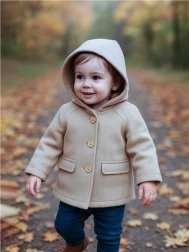 Nowoczesny design, drewniane guziki oraz nieco grubsza tkanina czynią z płaszczyka wszechstronny element garderoby na spacery, do przedszkola i na uroczyste okazje. Kaptur chroni głowę i uszy, zapewniając komfort w zmiennej pogodzie.