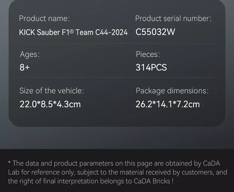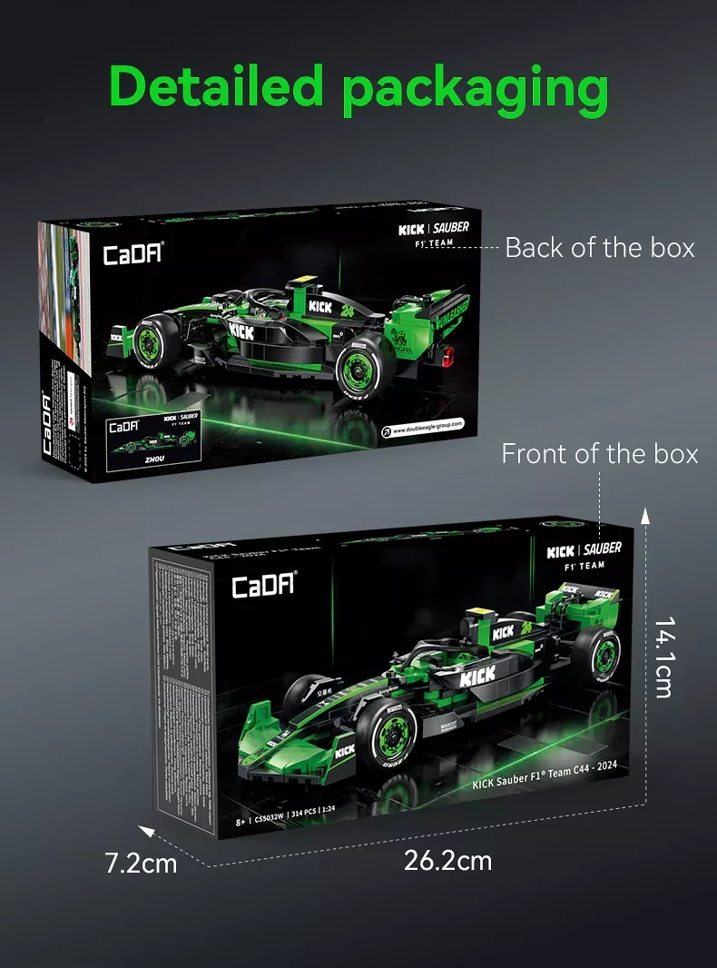 Zbuduj szczegółowy model wyścigowego bolidu F1 KICK SAUBER w skali 1:24 od marki CaDA. Zestaw zawiera 314 elementów z trwałymi nadrukami bez naklejek oraz umożliwia wybór numeru auta 24 (Zhou) lub 77 (Bottas). Realistyczne detale, takie jak system Halo, lusterka wsteczne, kierownica i opony Pirelli z logo, ucieszą zarówno dzieci, jak i dorosłych kolekcjonerów.