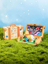 Stylowy kuferek pełni funkcję ramy i schowka. Po otwarciu odsłania kolorowe niebo z gwiazdami i planetami, tworząc efektowne tło dla całego dioramy.