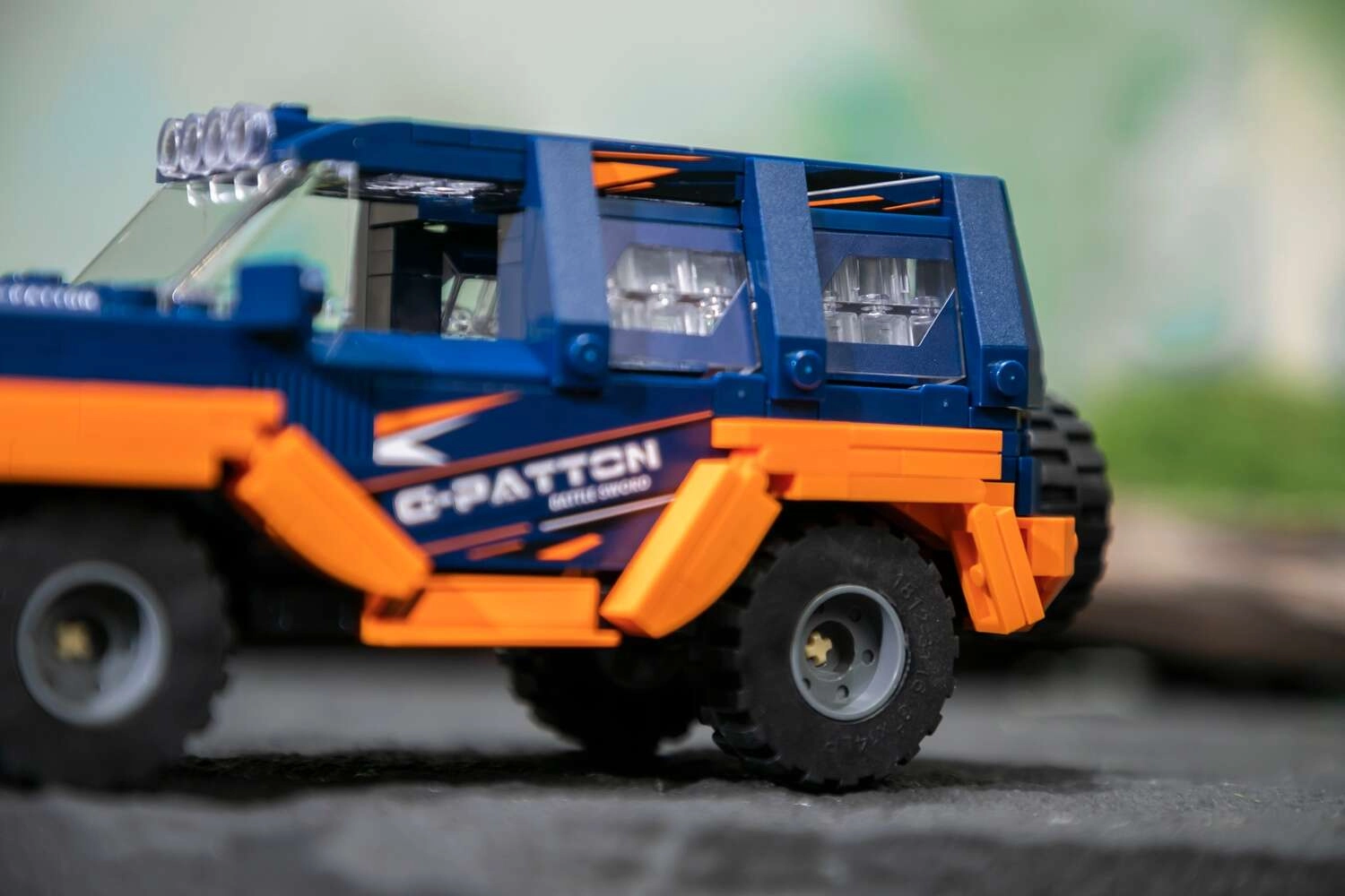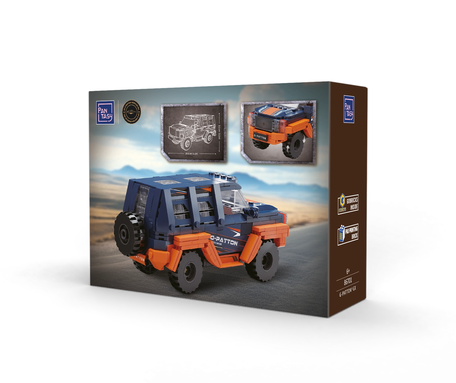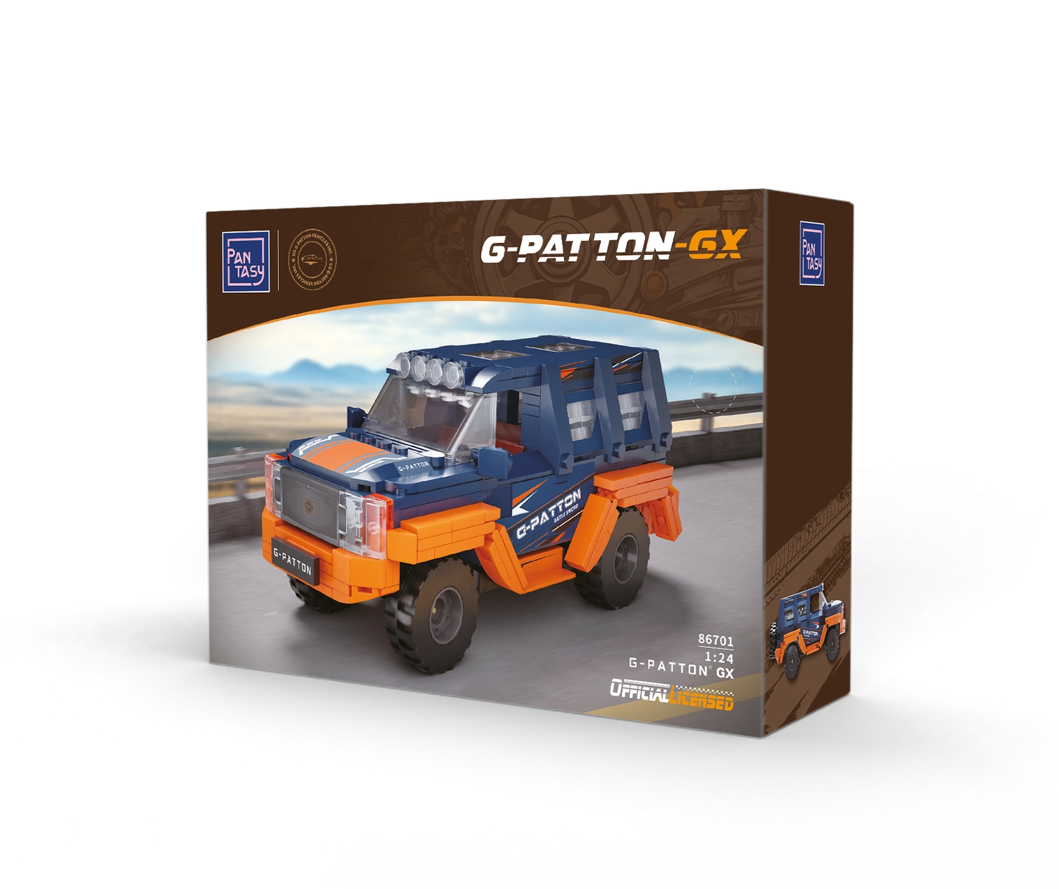Doświadcz radości z budowania z zestawem PANTASY G‑Patton GX. Wytrzymałe terenowe SUV wyróżnia się niebiesko‑pomarańczową stylistyką, przejrzystymi szybami, dopracowaną osłoną chłodnicy i światłami na dachu. Elementy z wysokiej jakości ABS trzymają pewnie, a nadruki pozostają piękne na długo – bez pęcherzyków i odklejania naklejek.