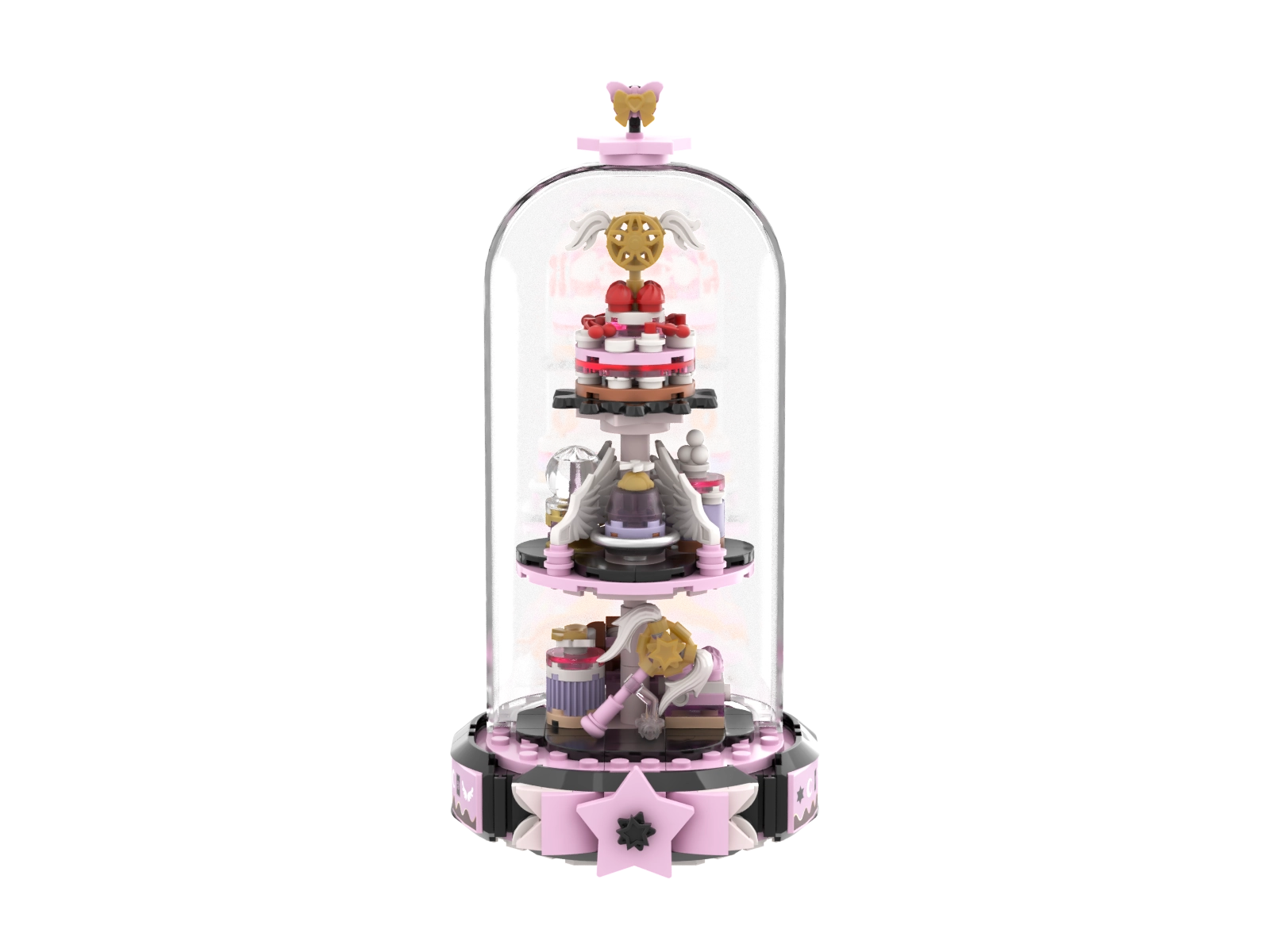 Odkryj magię kreatywnego budowania z eleganckim modelem, który zachwyca subtelną różowo‑złotą paletą i starannie zaprojektowanymi elementami. Trzypoziomowa patera pod krystalicznie przejrzystą kopułą prezentuje się jak eksponat wystawowy, a po złożeniu stanie się oryginalną ozdobą pokoju dziecięcego i biurka.