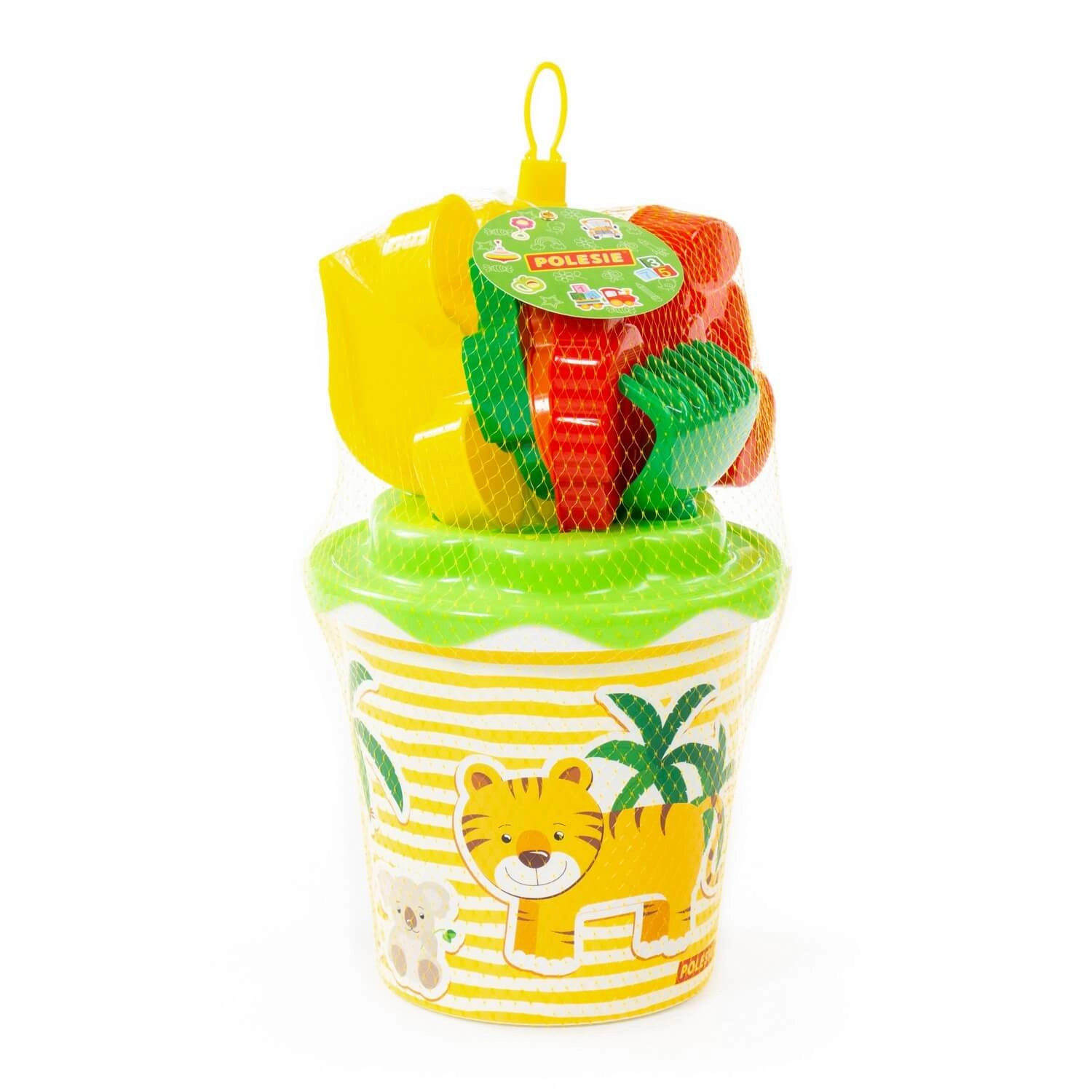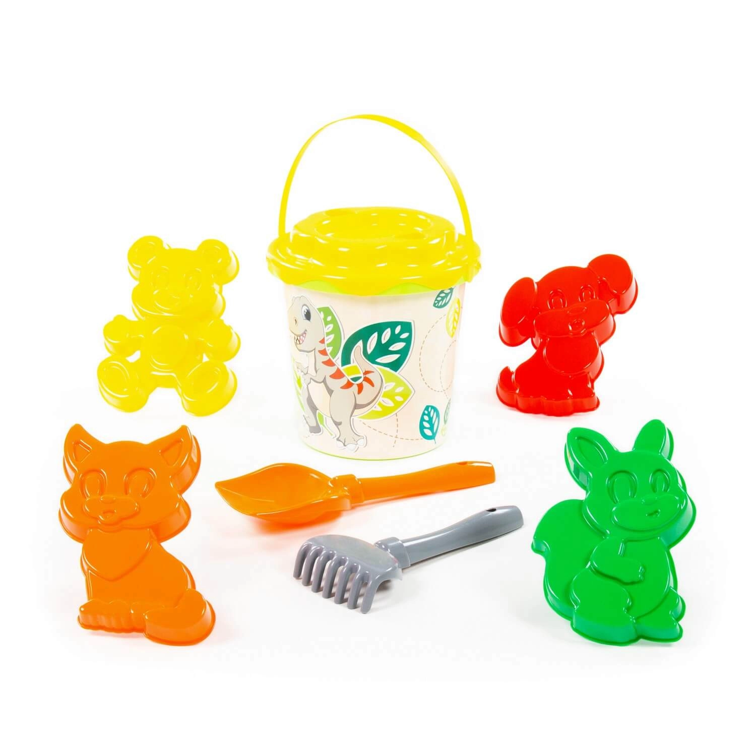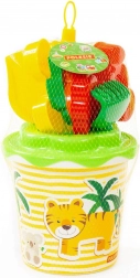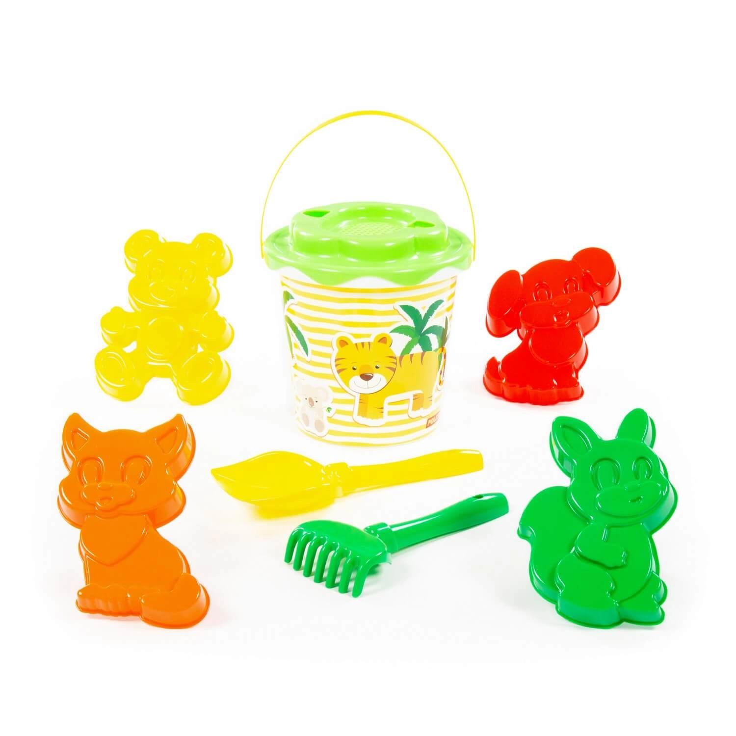 - Kompletne wyposażenie – wiaderko z uchwytem i pokrywką, łopatka, grabki oraz kilka zwierzęcych foremek.
