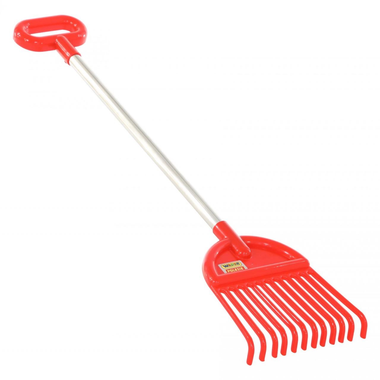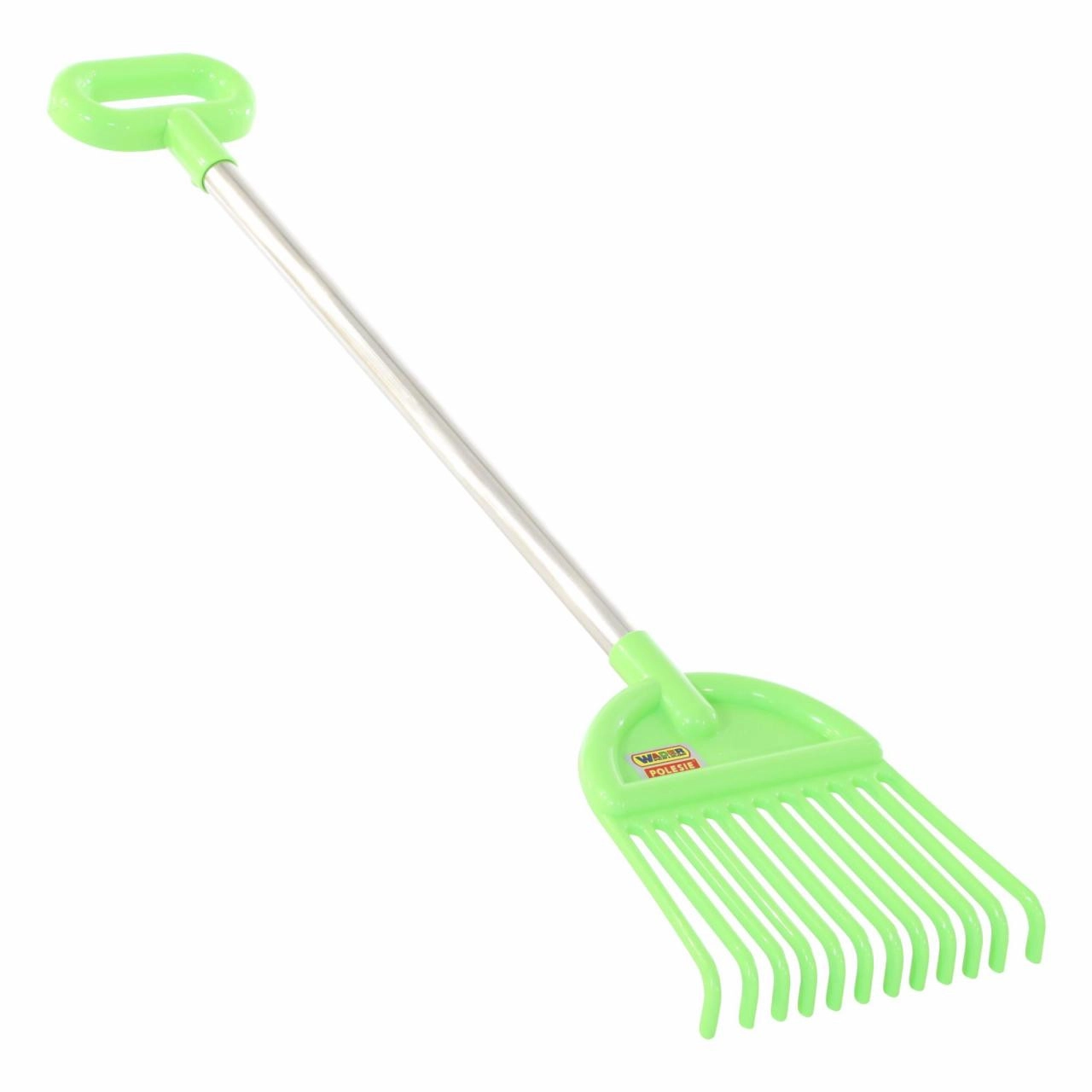 Solidny trzonek z plastikową głowicą i wygiętymi zębami zapewnia efektywne zbieranie piasku i liści.