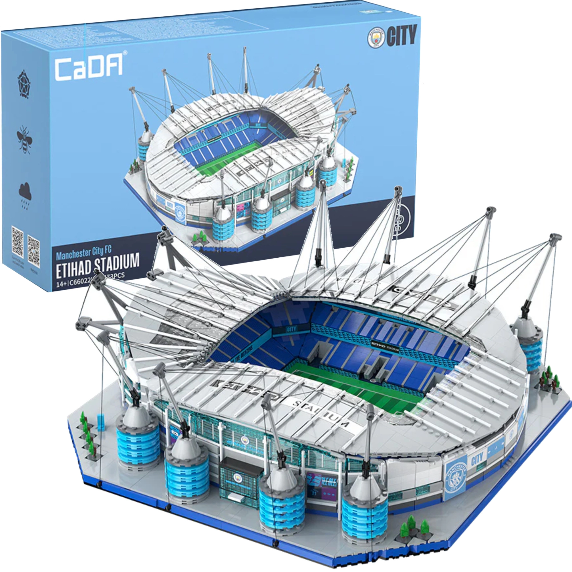 Przeżyj premiumowe doświadczenie budowania z modelem stadionu Etihad – ikonicznego domu klubu MANCHESTER CITY. Zestaw CADA stawia na autentyczność i precyzyjne wykonanie, od zielonej murawy z bramkami, przez stopniowane trybuny, po charakterystyczne wieżowe pylony z olinowaniem i detale fasady.