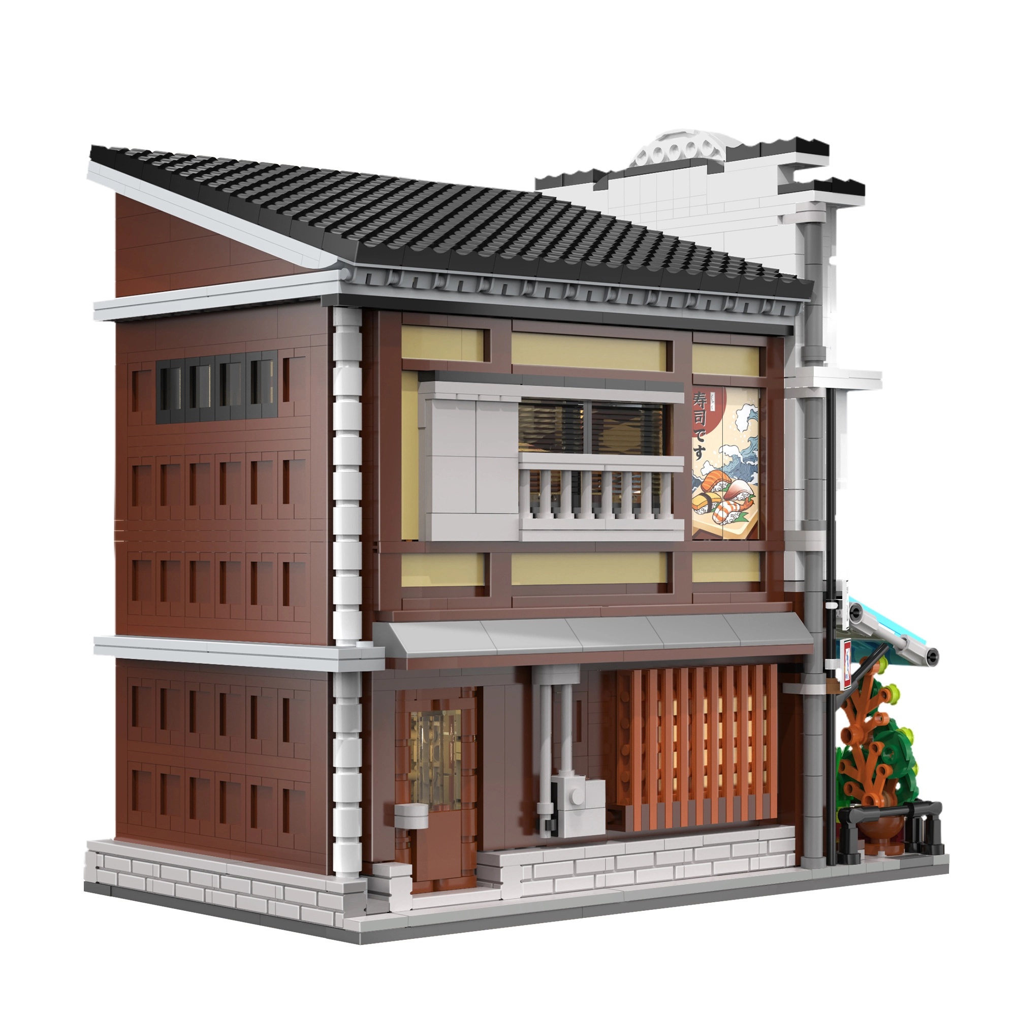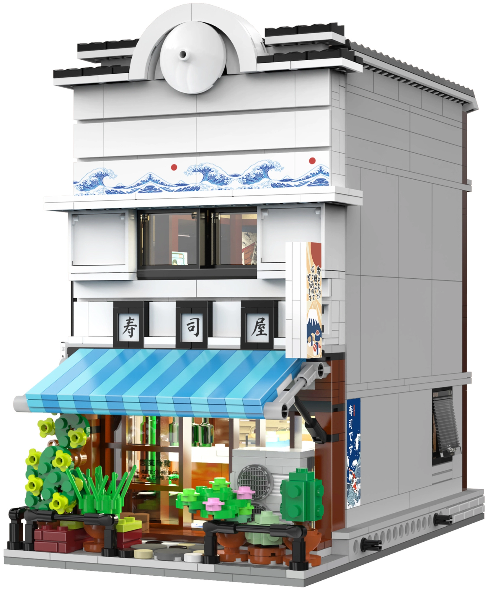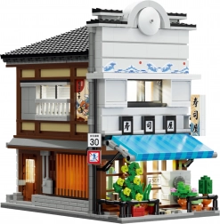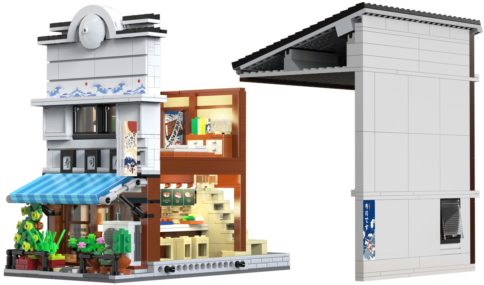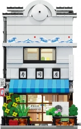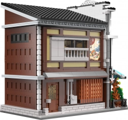 Ten designerski zestaw przedstawia autentyczny japoński, dwupiętrowy sklep z sushi z naciskiem na detale wnętrza i elewacji. Otwierana konstrukcja pozwala łatwo zajrzeć do środka – znajdziesz tu hokery barowe, dekoracyjny bambus, schody oraz przytulny pokój na piętrze z łóżkiem, telewizorem i komodą.