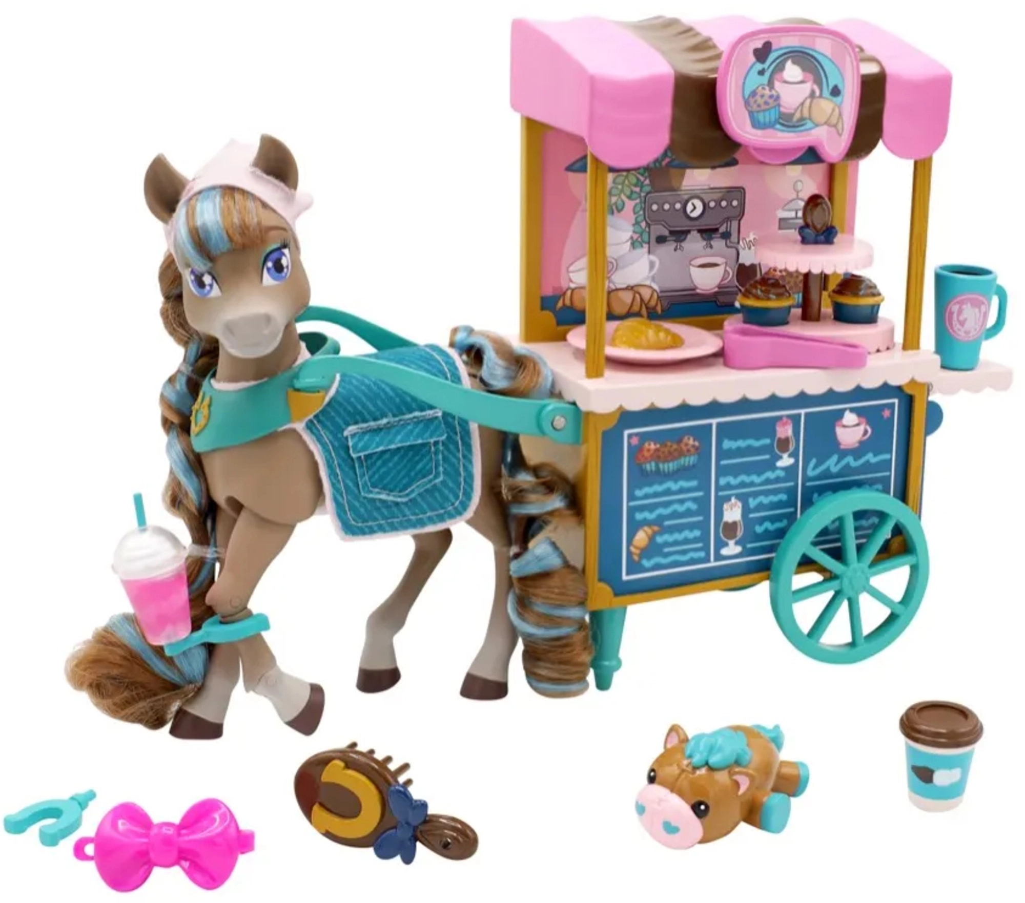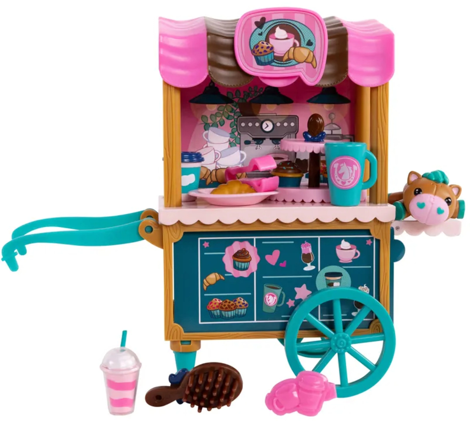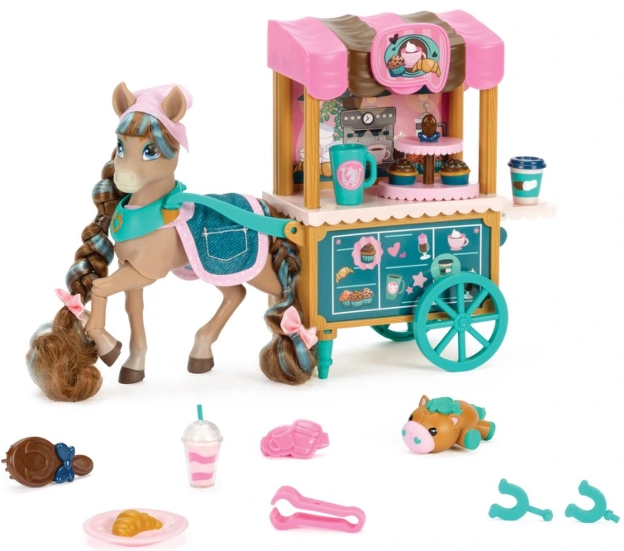 Wózek ma obrotowe kółka, rączkę i półki na smakołyki, kolorowy daszek oraz grafikę kawiarni. Zestaw zawiera także akcesoria do serwowania i pieczenia, małego zwierzaka oraz szczotkę do stylizacji grzywy. Wszystko zaprojektowane do kreatywnej zabawy w odgrywanie ról, rozwijania motoryki małej i umiejętności społecznych.