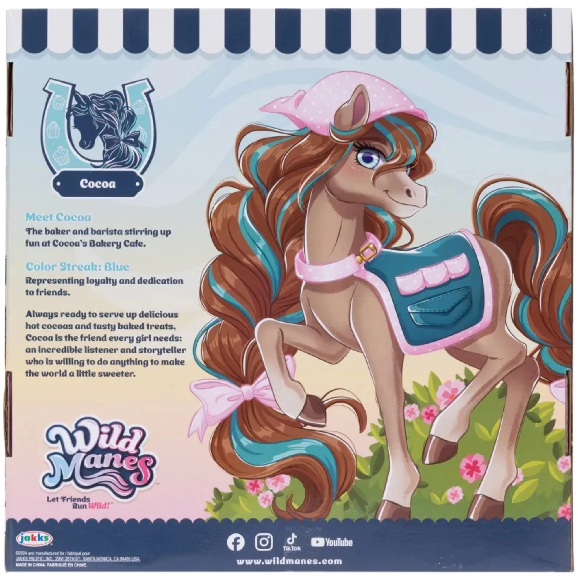 Konik Cocoa z ulubionego serialu WILD MANES przychodzi z dopracowanym wózkiem Bakery Café, gdzie może serwować napoje i wypieki. Figurka ma szczegółowo wykoną grzywę z warkoczykami, wyraziste oczy i nosi stylowy fartuszek – gotowa na każdą przygodę. Dzięki klipsom w kształcie podkowy Cocoa może trzymać akcesoria i łatwo odgrywać różne scenki.