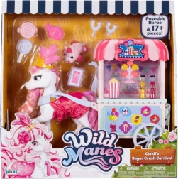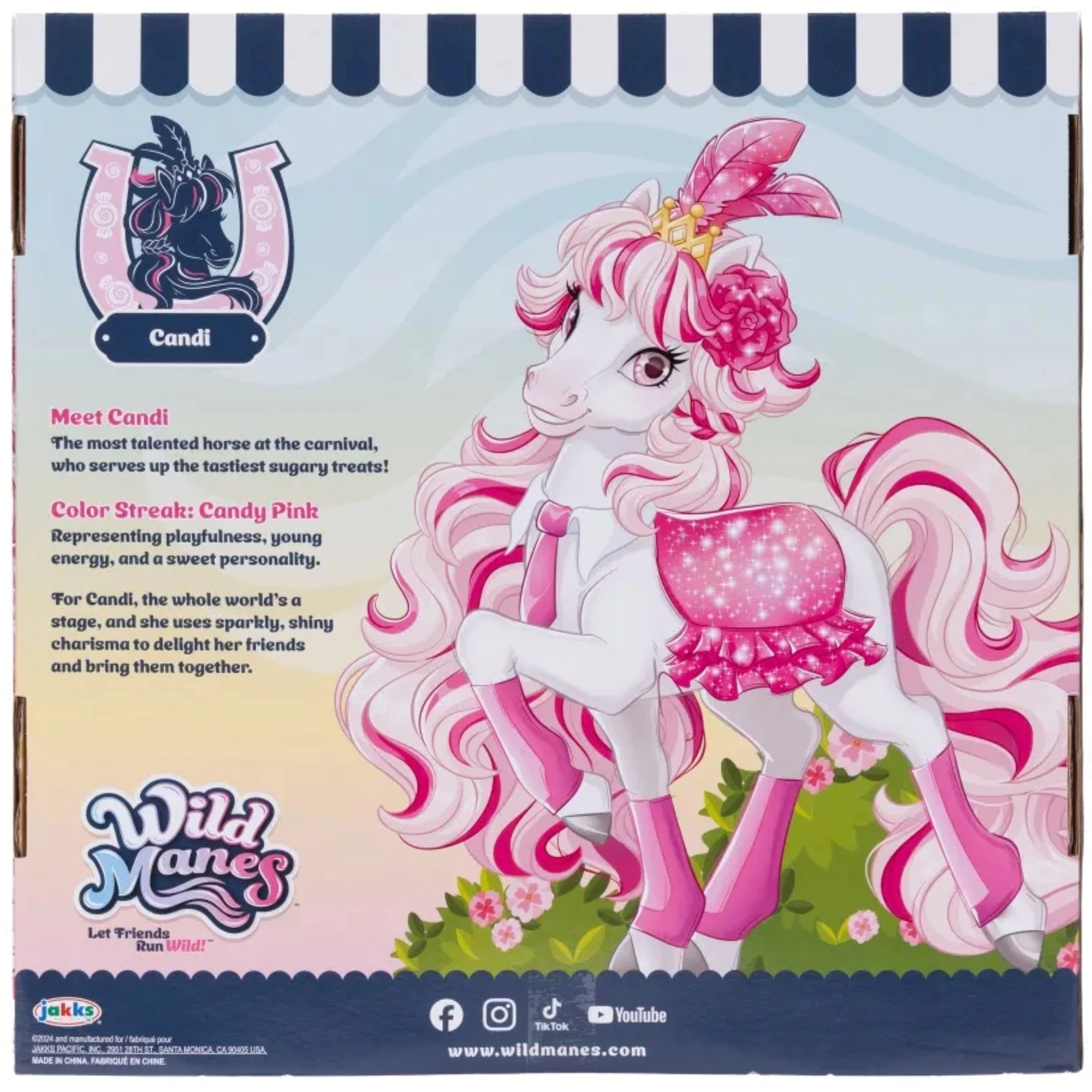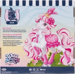 Jednorożec Candi zachwyca białym ciałkiem, różową grzywą i ogonem, błyszczącą koroną oraz stylowym ubrankiem. Dzięki ruchomym kończynom figurkę można łatwo ustawiać w różnych pozach i na nowo przeżywać ulubione sceny ze świata WILD MANES.