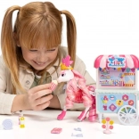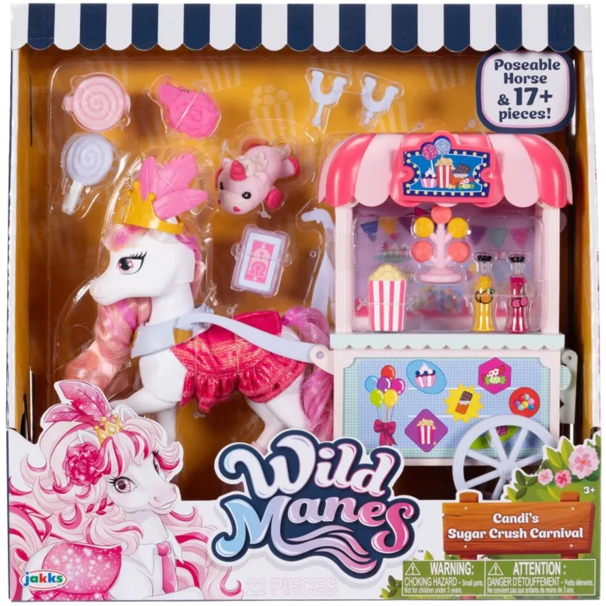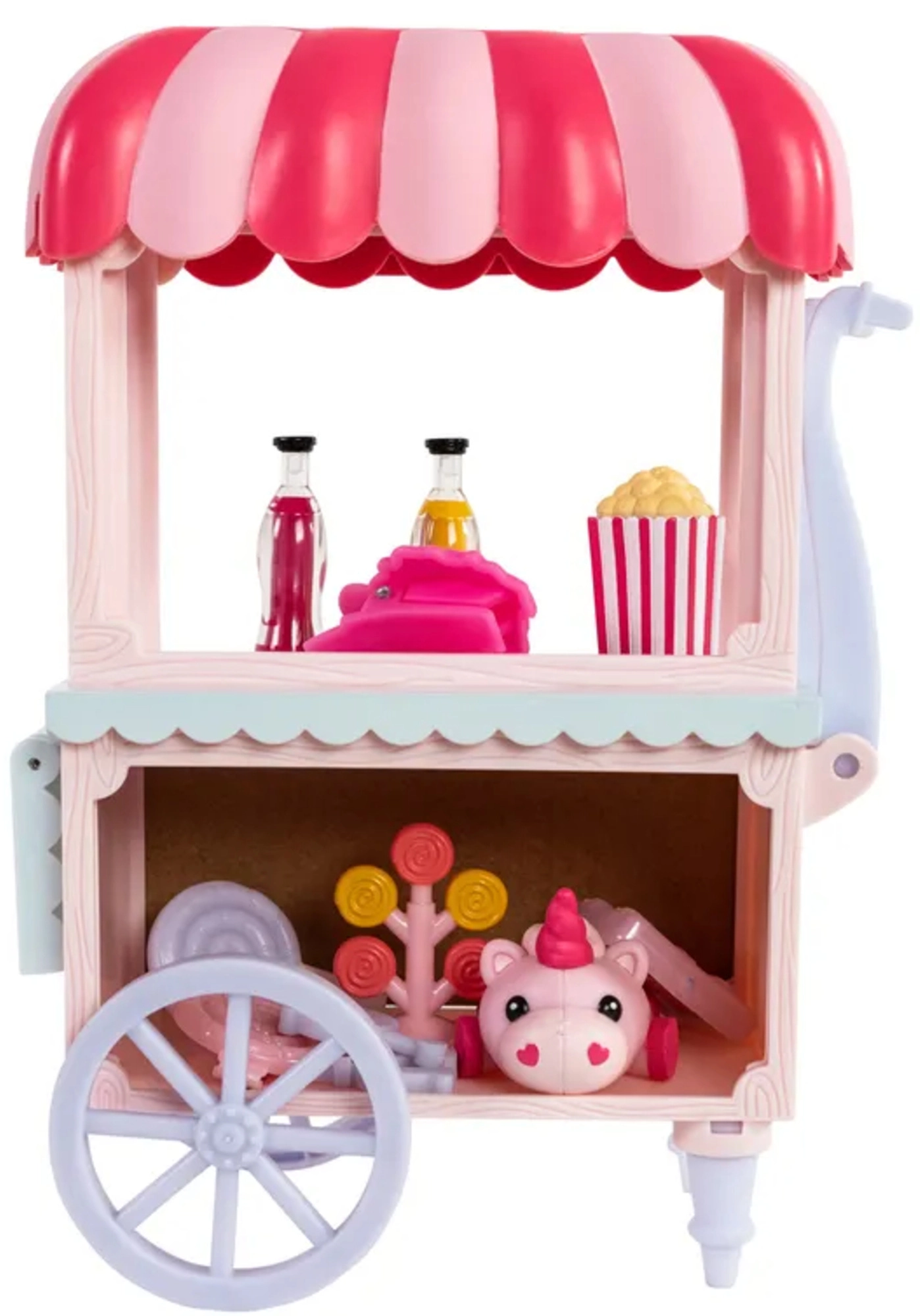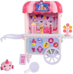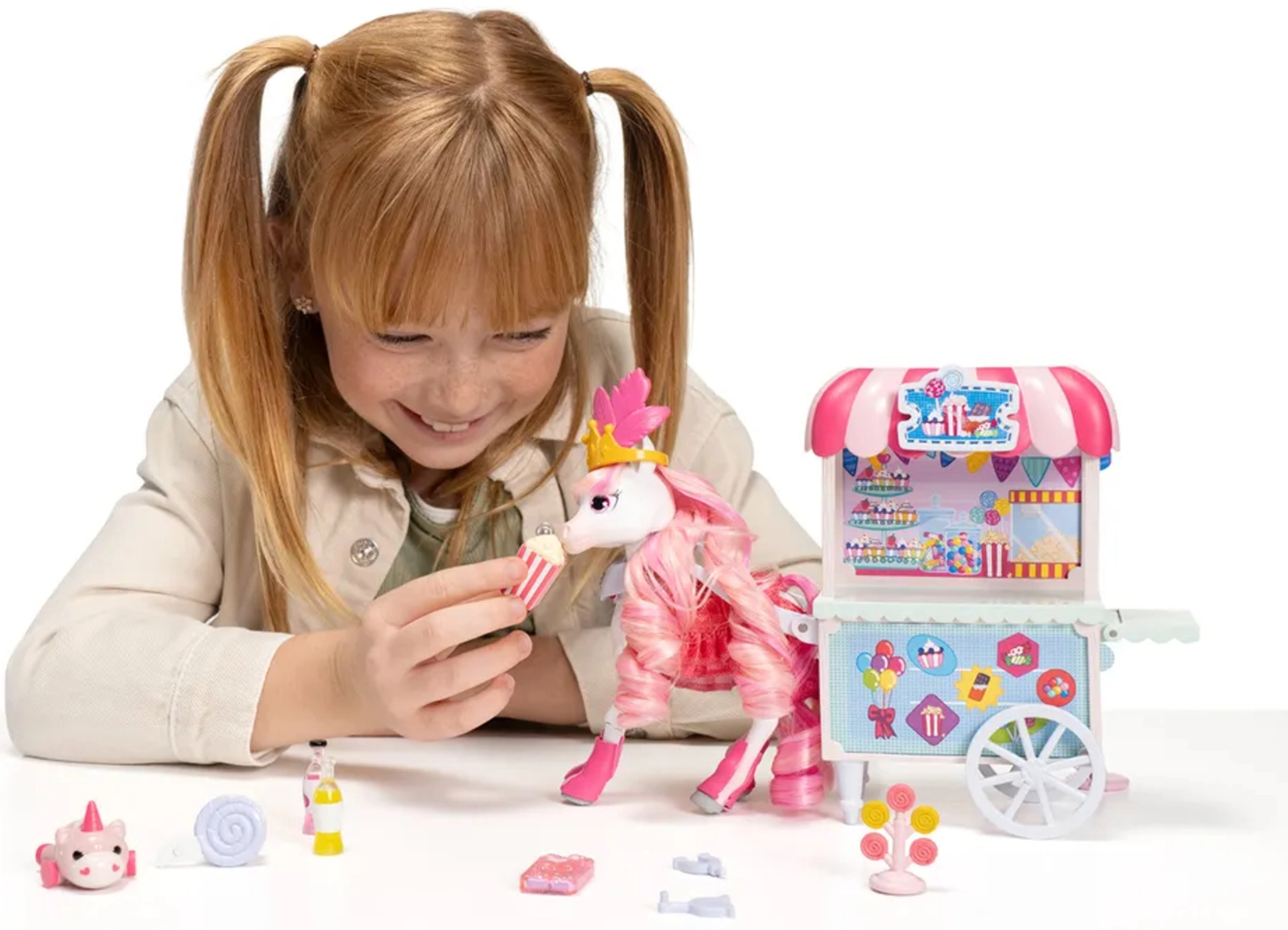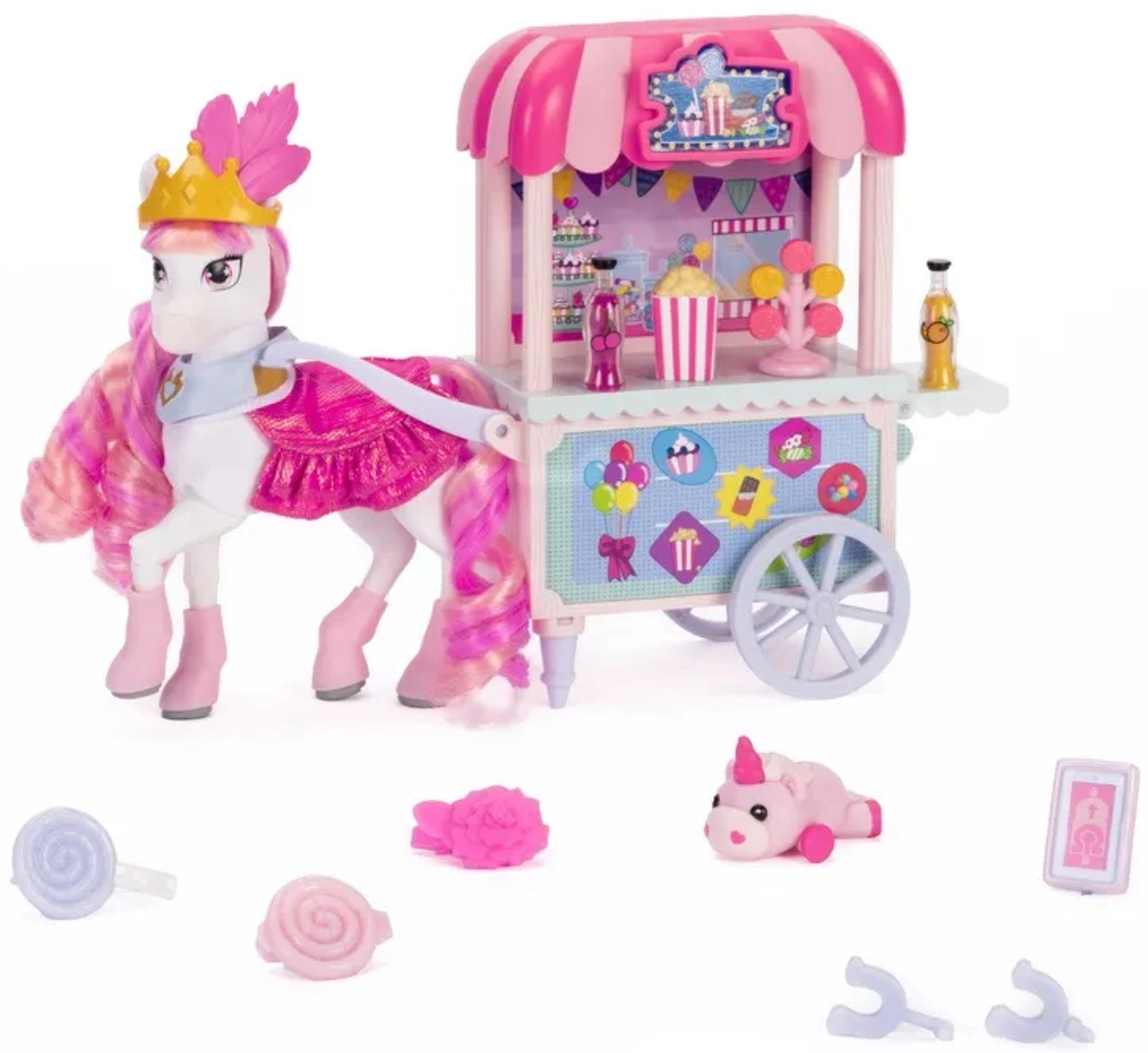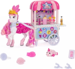 Kolorowe stoisko Sugar Rush Carnival z pasiastym daszkiem i funkcjonalnymi kółkami jest gotowe na sprzedaż popcornu, lizaków i napojów. Za pomocą dyszla/lejca wózek można podłączyć do Candi i wyruszyć na słodką przejażdżkę po miasteczku Mane Lane. W zestawie są też drobne akcesoria do pielęgnacji i stylizacji – szczotka, spinki i inne.