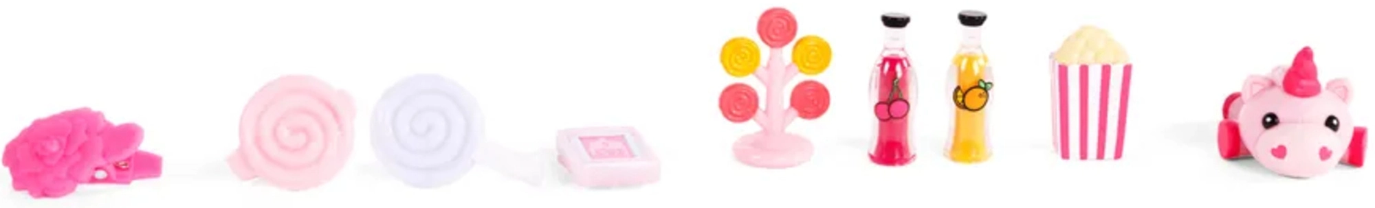 Popcorn, lizaki, napoje i inne drobiazgi do realistycznej zabawy. Nie brakuje szczotki i spinek do stylizacji grzywy.