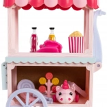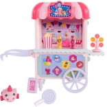 Kolorowy wózek z pasiastym daszkiem, schowkiem i uchwytem. Można go podłączyć do Candi i wyruszyć sprzedawać słodkości.