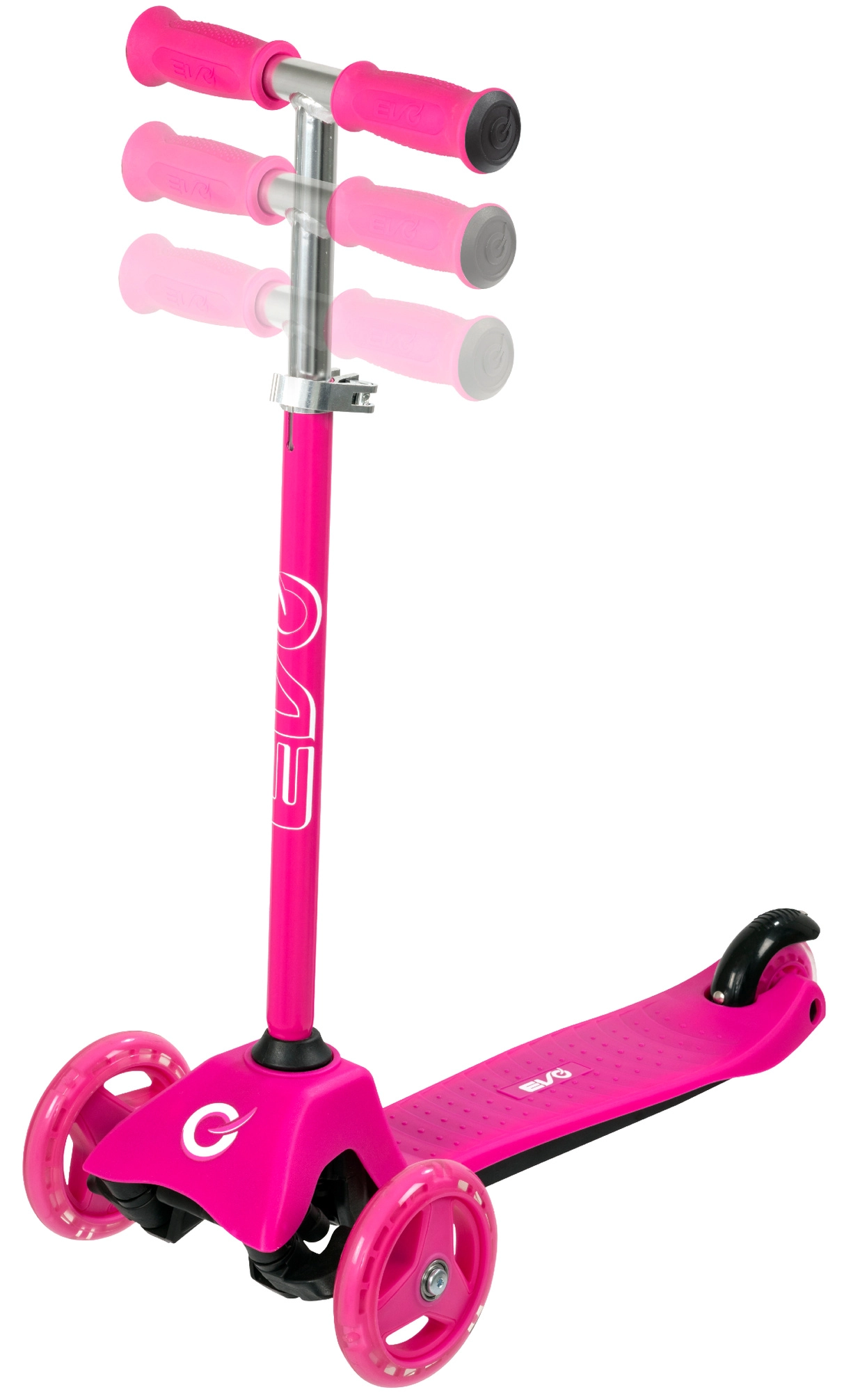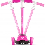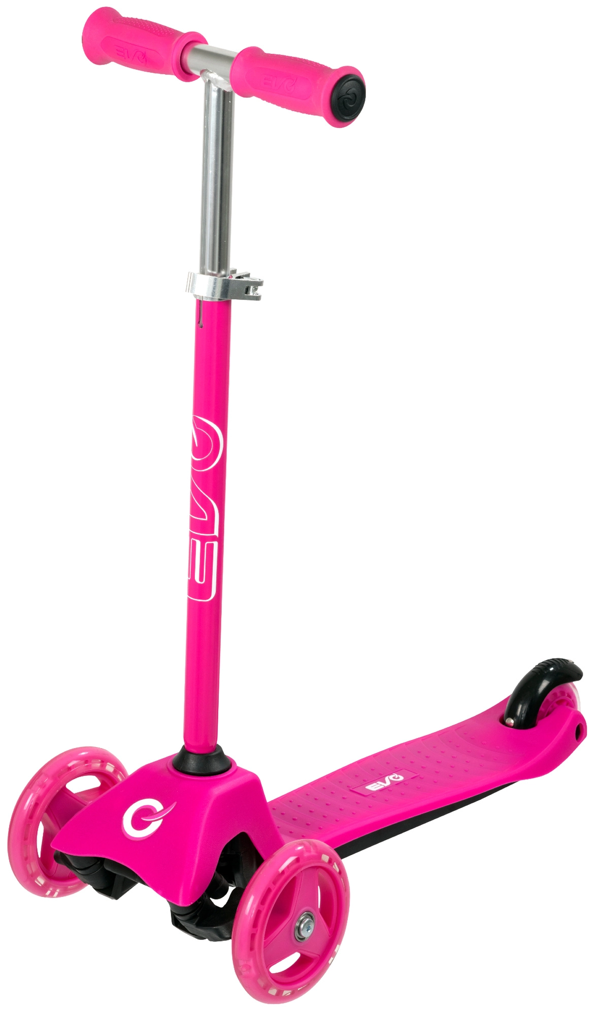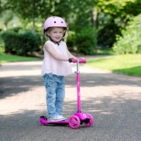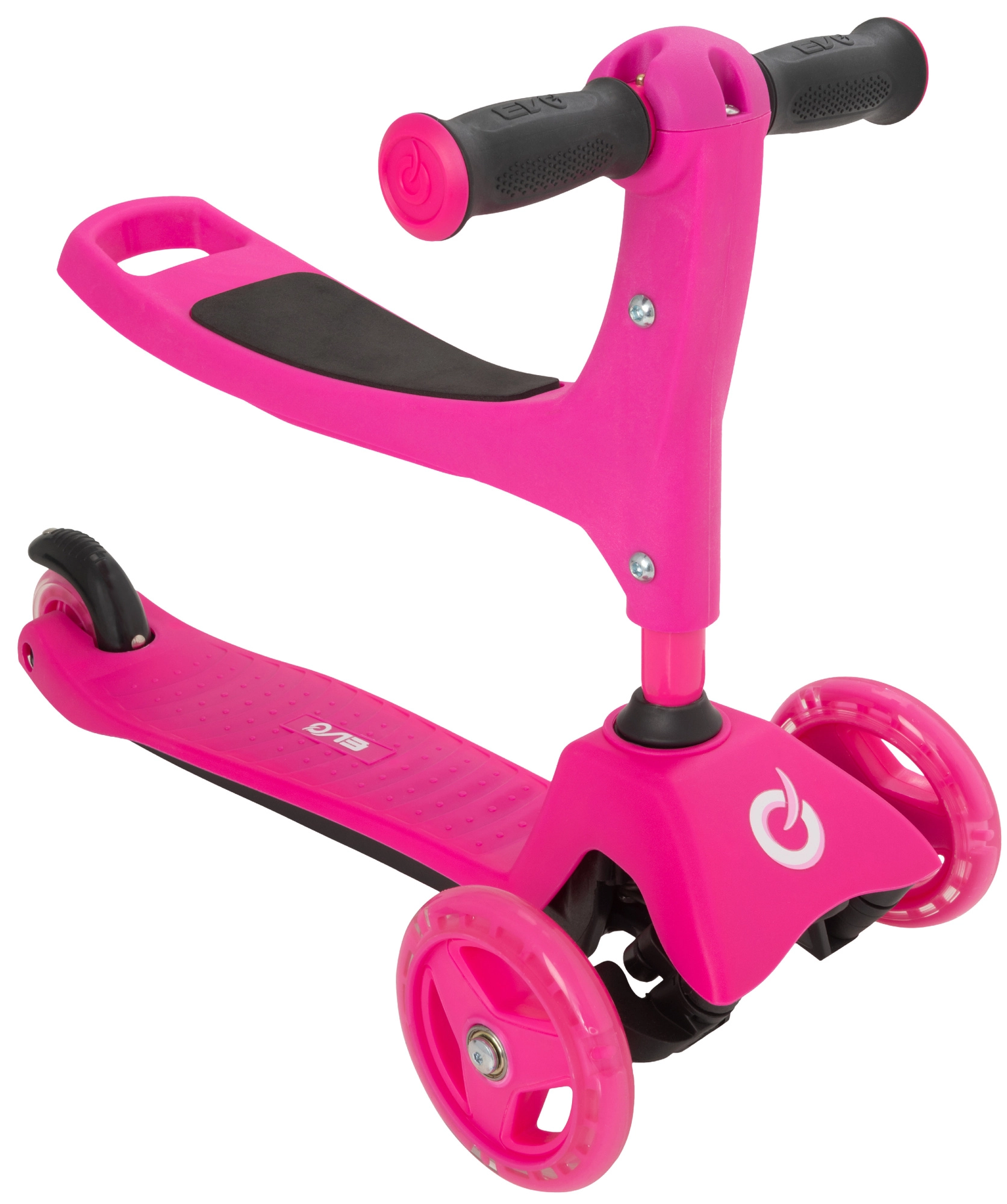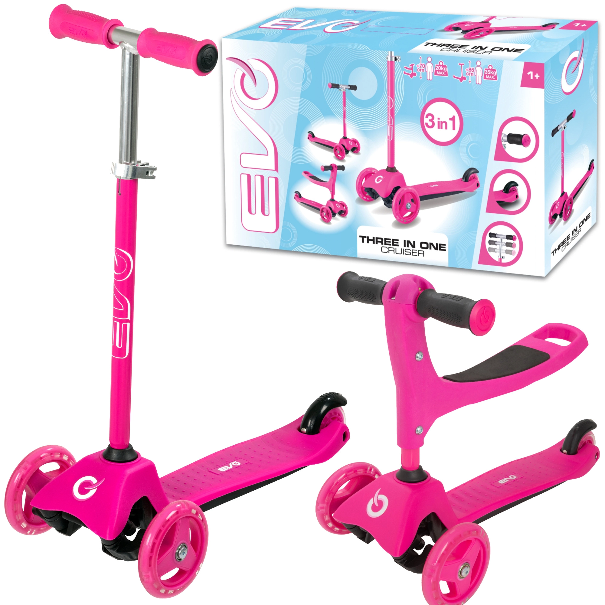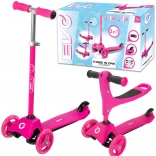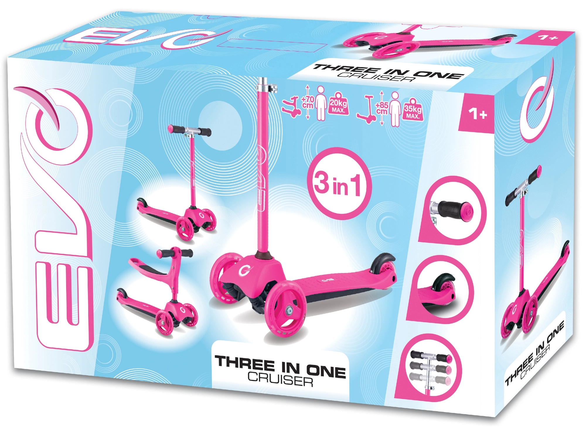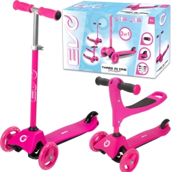 Różowa dziecięca hulajnoga 2w1 EVO rośnie razem z Twoim dzieckiem: w mgnieniu oka zmienisz ją z jeździka z siedziskiem w stabilną trójkołową hulajnogę. Dzięki dwóm przednim kołom, nisko osadzonej platformie i skręcaniu przechyłem oferuje doskonałą stabilność, łatwe sterowanie i bezpieczne hamowanie tylnym błotnikiem. Regulowana wysokość kierownicy, ciche kółka z łożyskami ABEC-5 oraz antypoślizgowy podest zapewniają wygodną i frajdową jazdę dla najmłodszych i starszych dzieci.