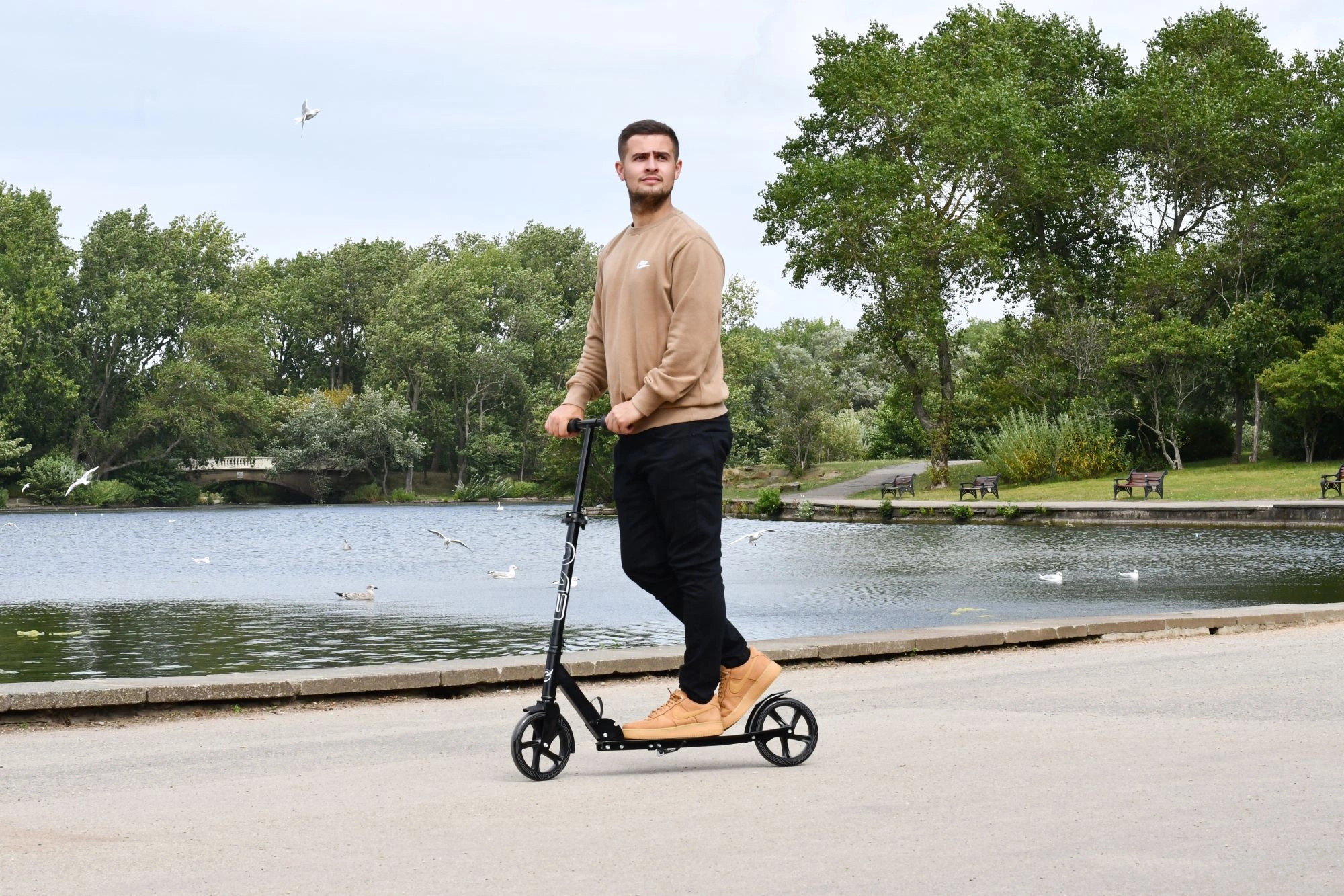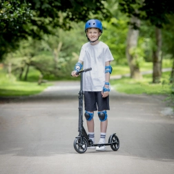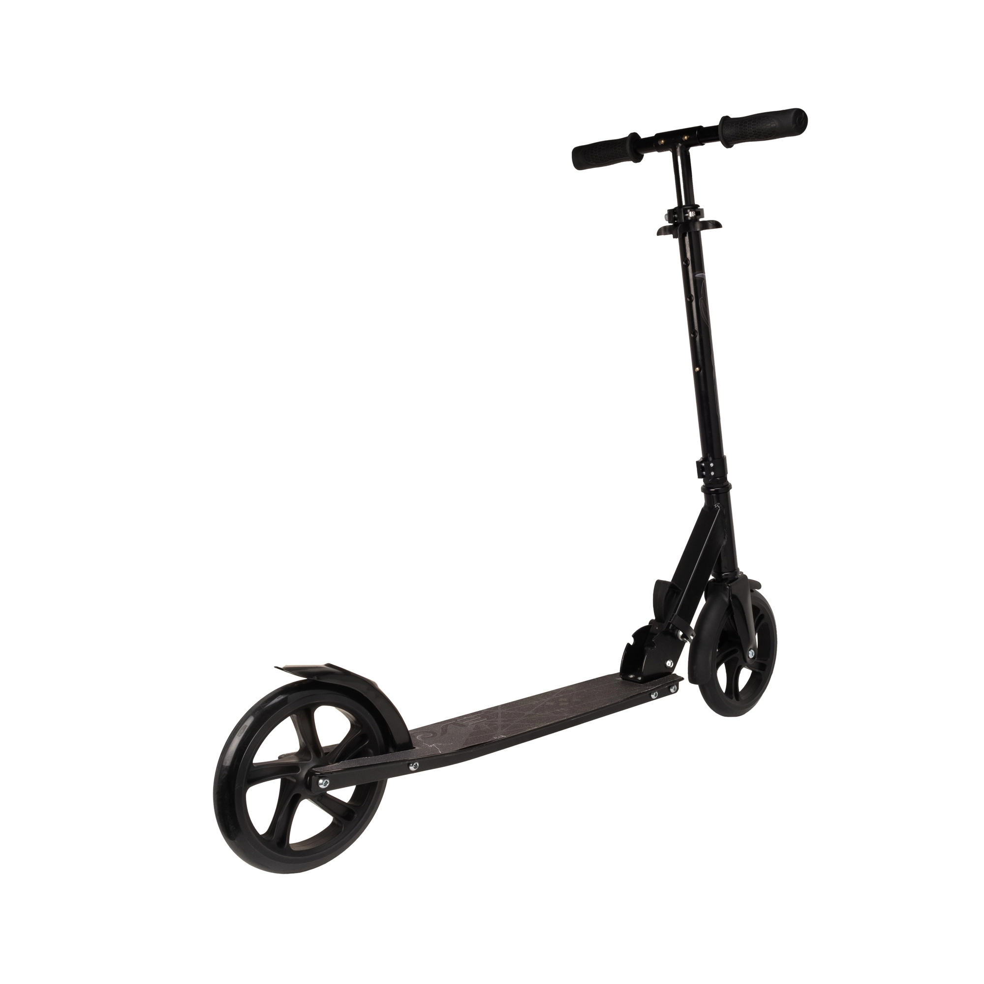 Wytrzymałą ramę w uniwersalnym czarnym kolorze uzupełnia tylny błotnik, który pełni również funkcję hamulca nożnego dla szybkiego i bezpiecznego zatrzymania. Dzięki składanej konstrukcji i paskowi na ramię przenoszenie i przechowywanie są maksymalnie wygodne – w domu, w szkole i w podróży.