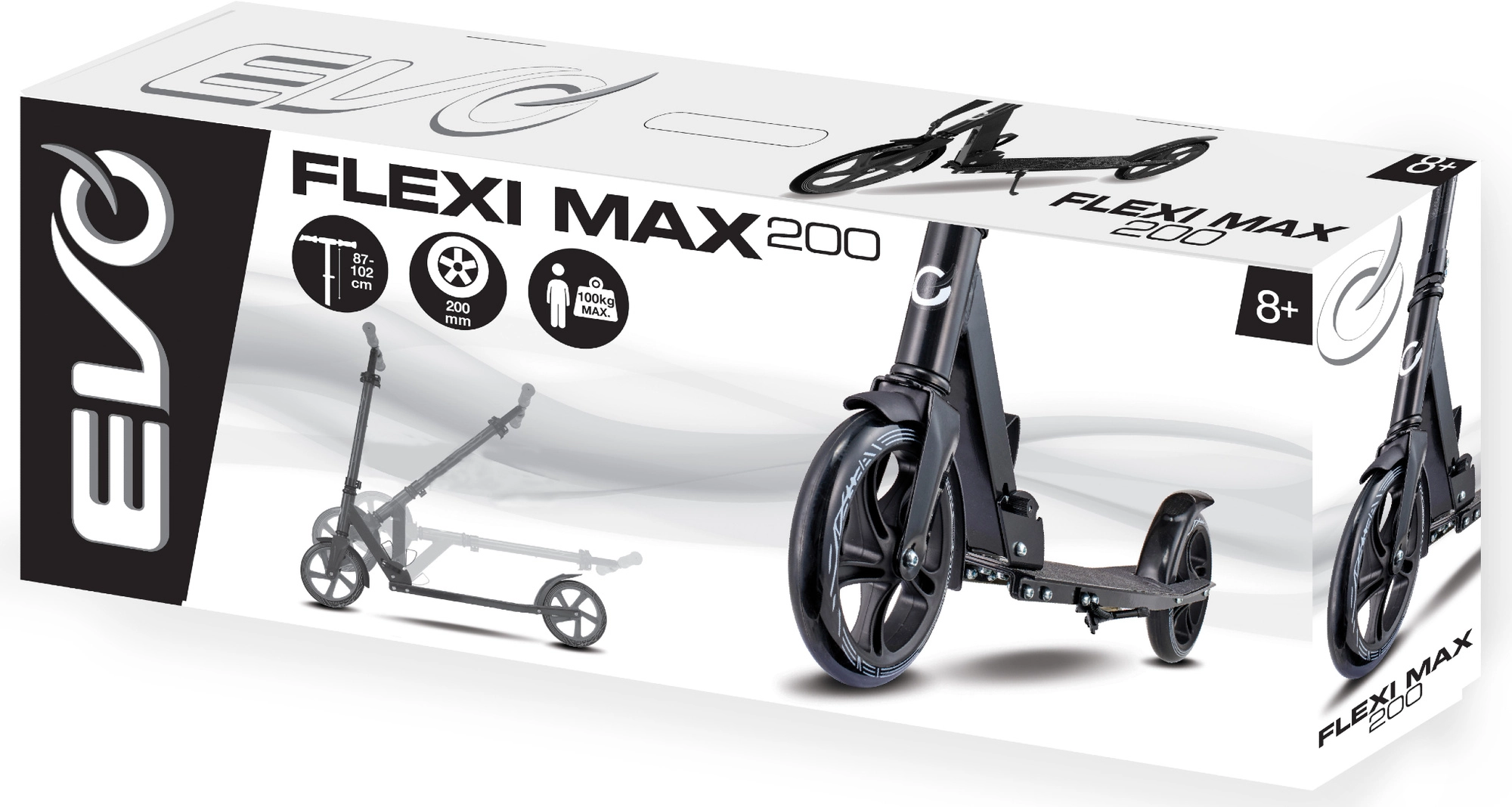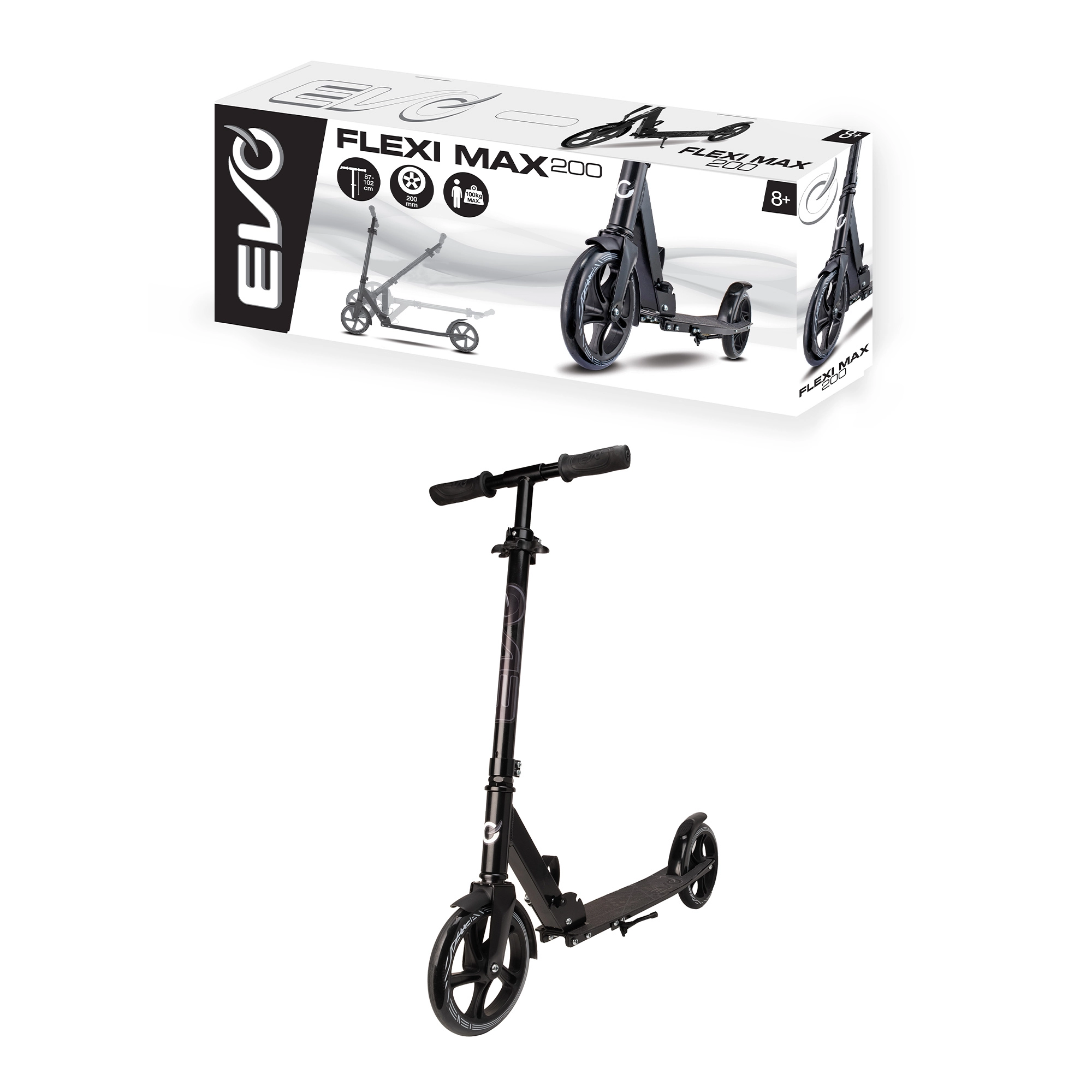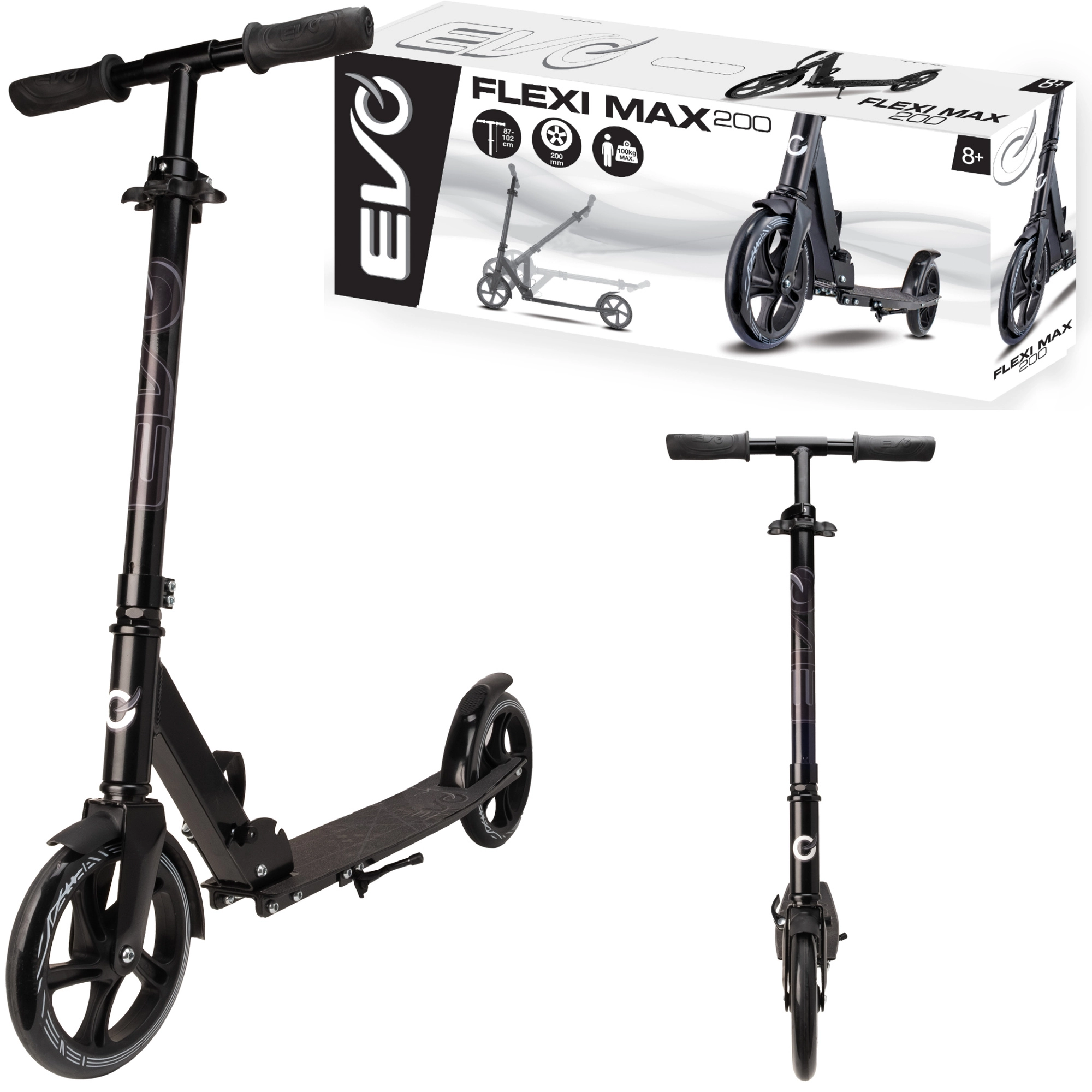 EVO Flexi Max 200 to niezawodna miejska hulajnoga zaprojektowana do wygodnych dojazdów i rekreacyjnej jazdy. Duże koła 200 mm z łożyskami ABEC-7 zapewniają mniejszy opór i szybsze przyspieszenie, a gumowe gripy TPR dają pewny chwyt bez poślizgu. Regulowana wysokość kierownicy (ok. 87–102 cm) rośnie wraz z użytkownikiem, a składany stojak ułatwia parkowanie.