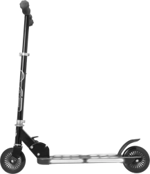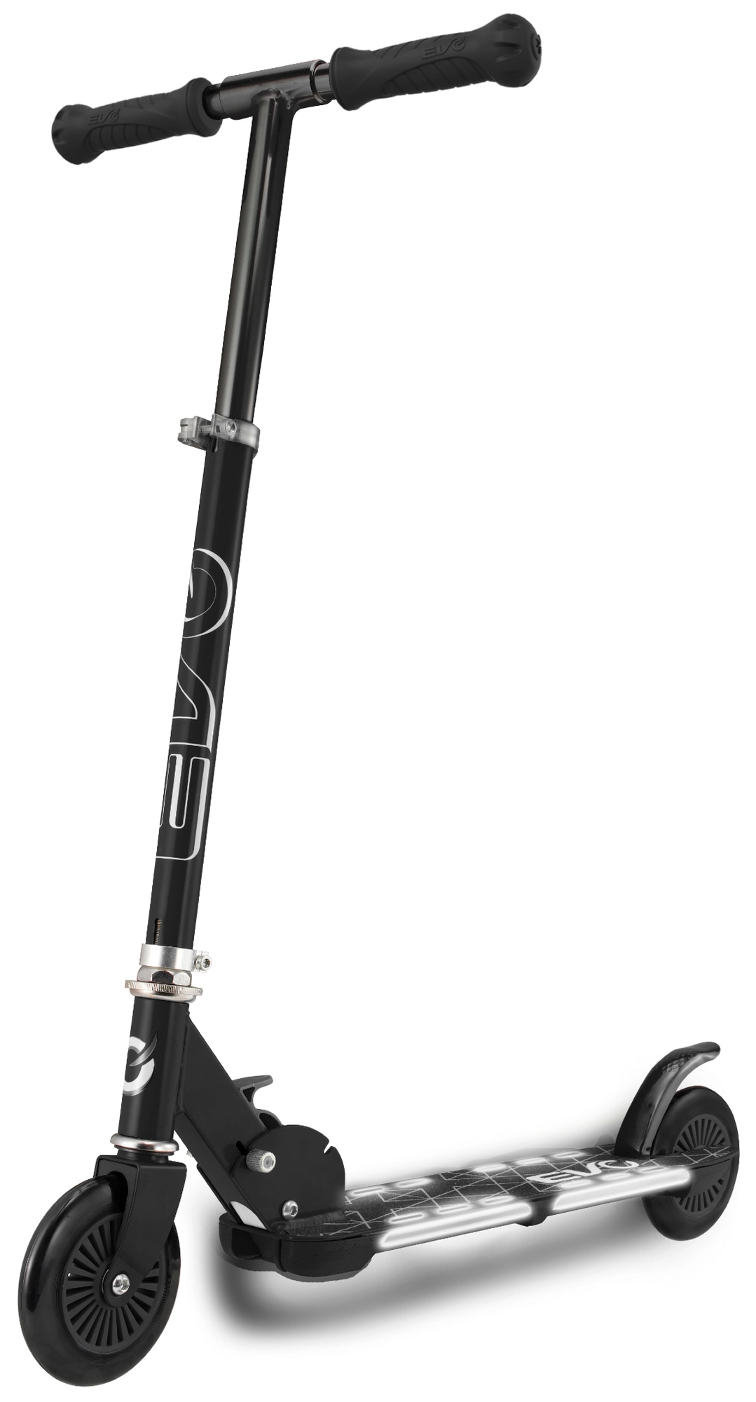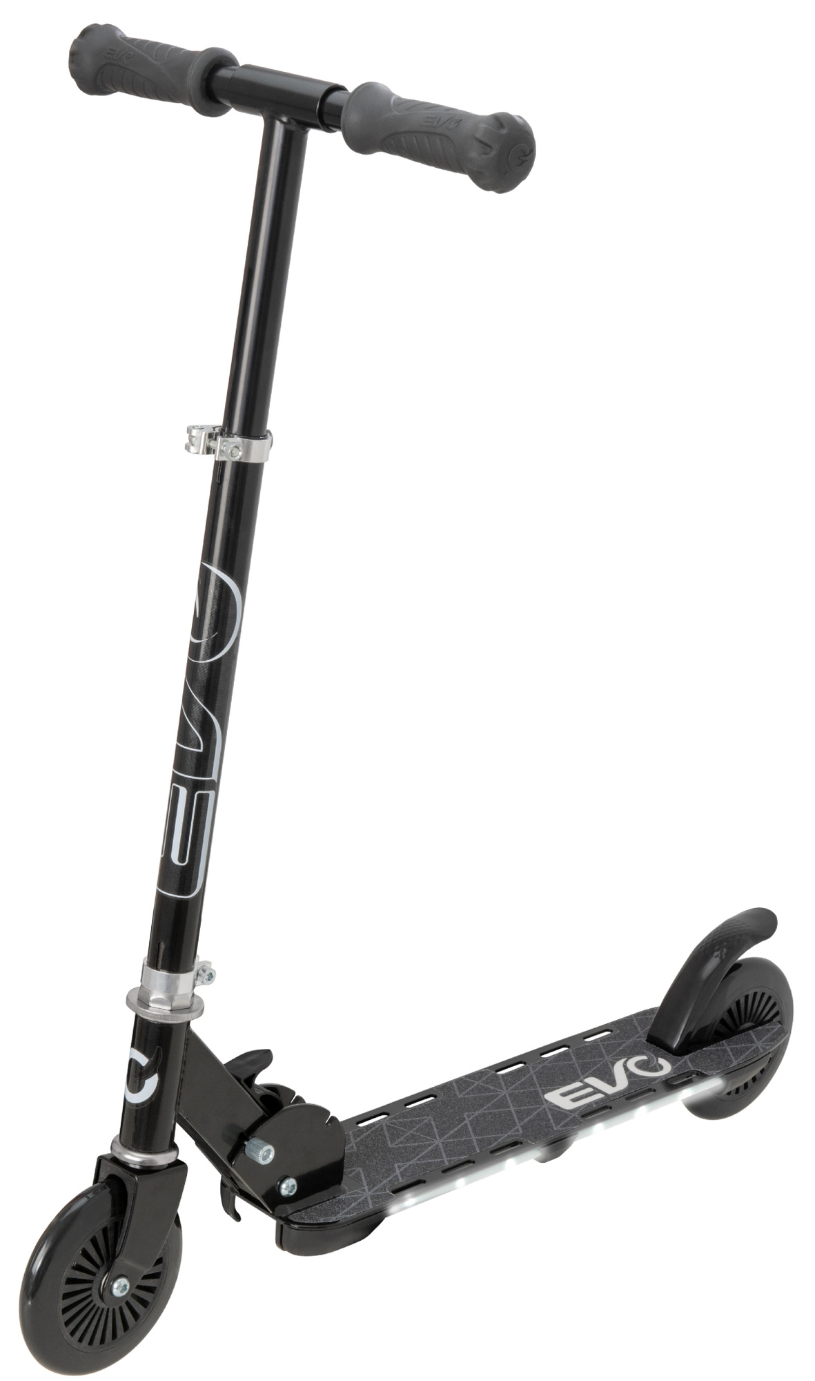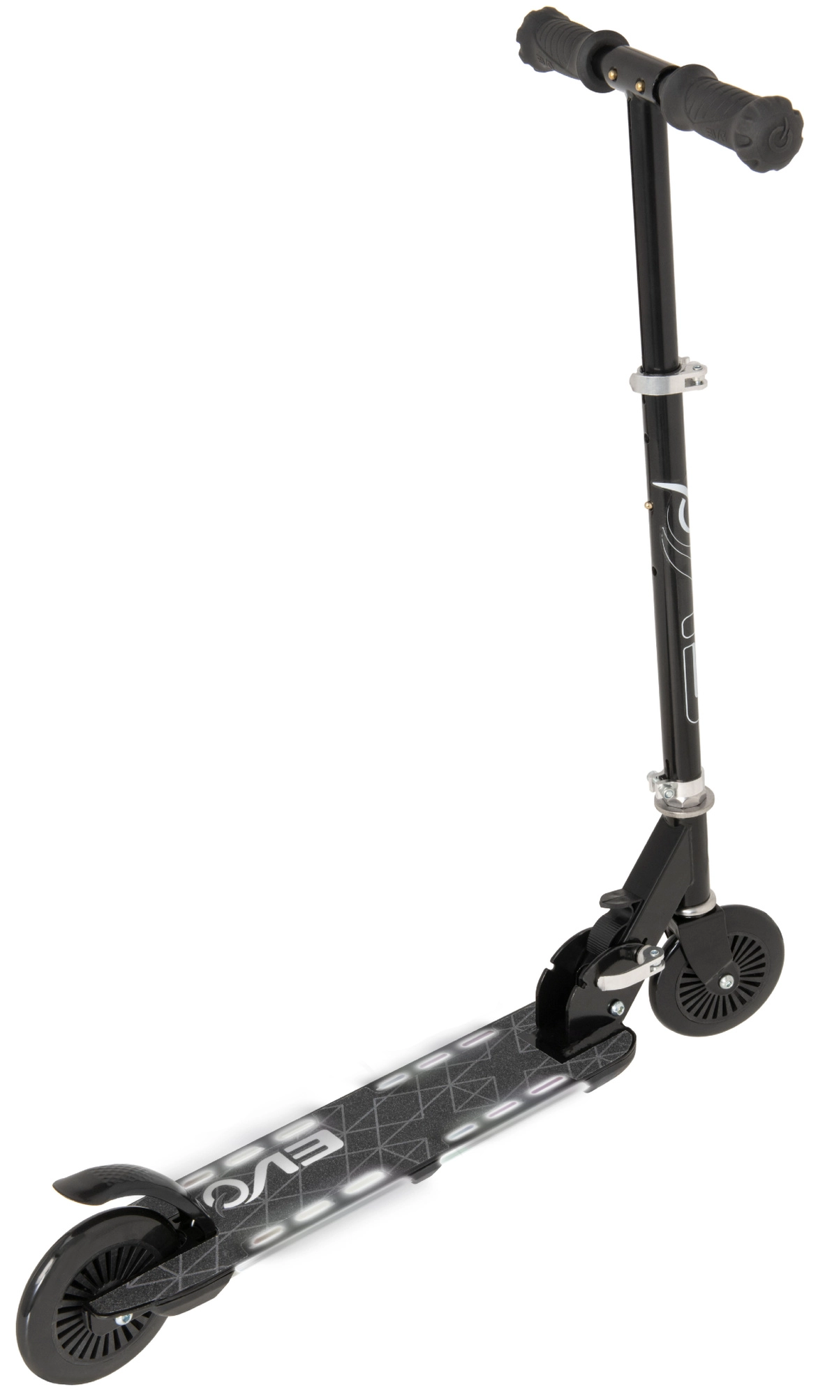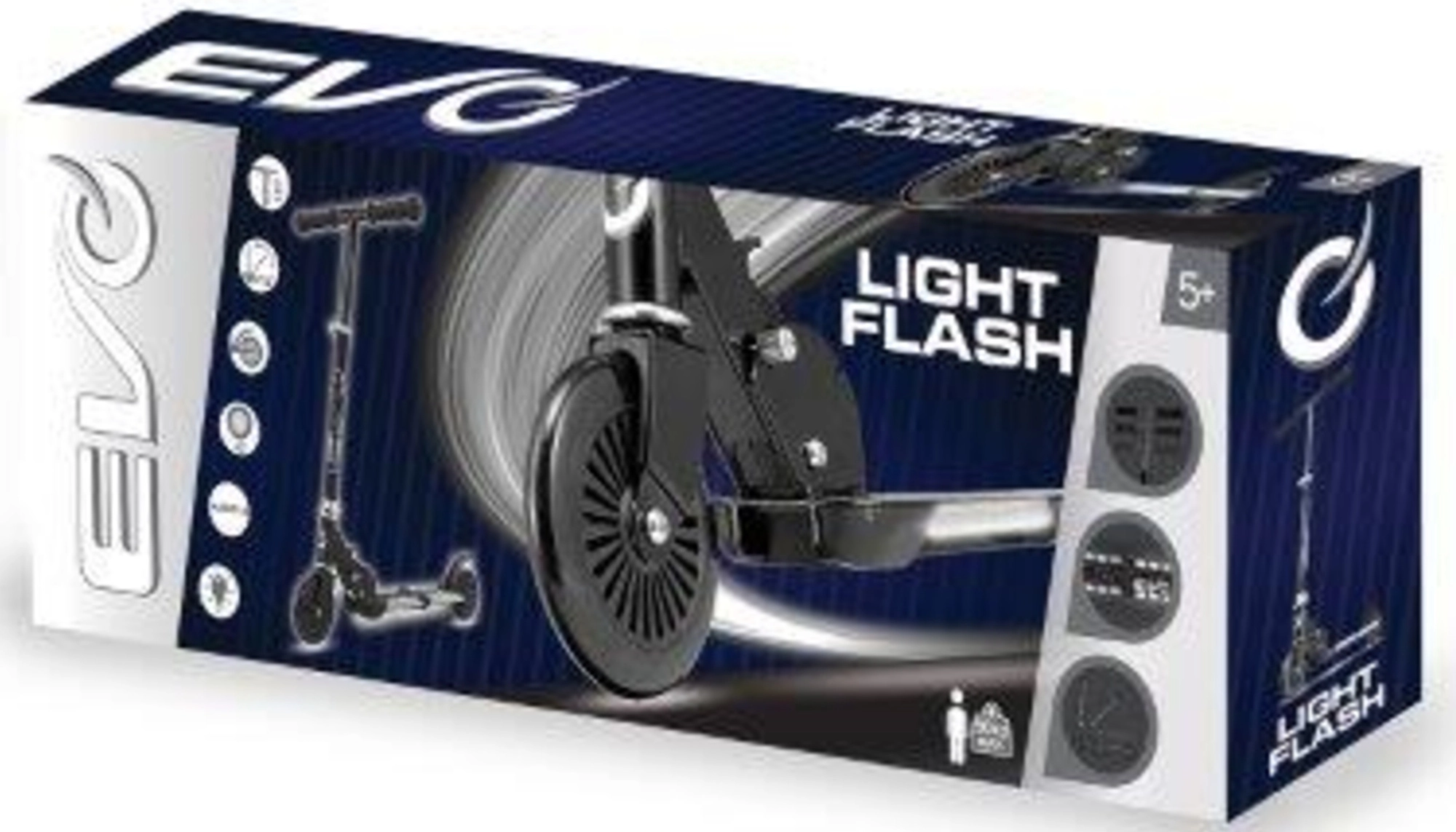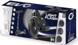 Dziecięca hulajnoga EVO Light Flash jest lekka, składana i ma regulowaną kierownicę dla dzieci od 5 lat. Oferuje ciche, gumowe kółka z łożyskami ABEC-5, hamulec nożny na tylnym błotniku oraz zabawny podświetlany podest na 4× AAA. Idealna do rekreacyjnej jazdy po równej nawierzchni z naciskiem na stabilność i bezpieczeństwo.