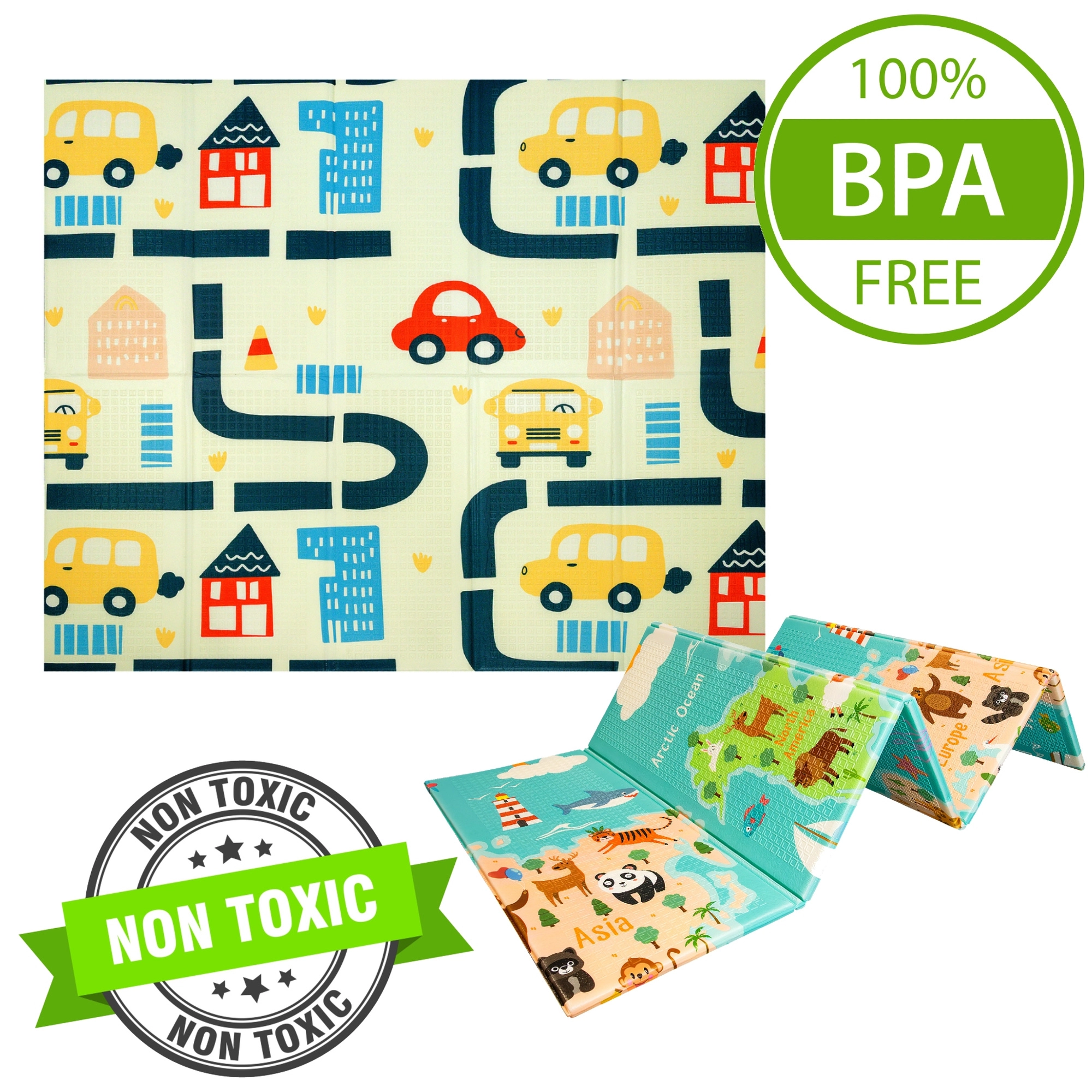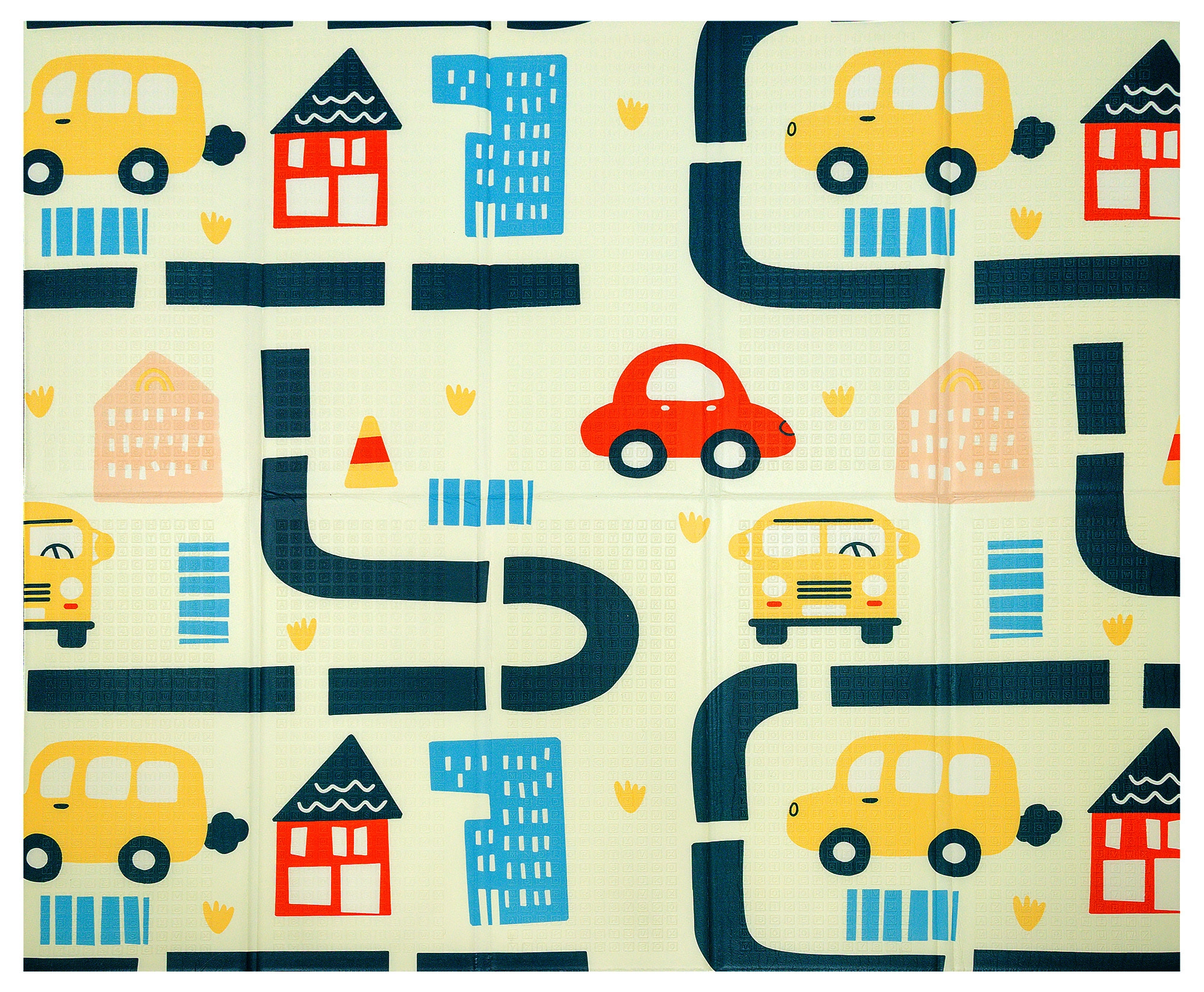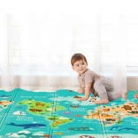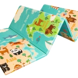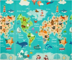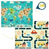Jedna strona z kolorową mapą świata i zwierzętami, druga z miasteczkiem i drogami dla resoraków. Dwa edukacyjne motywy w jednej macie rozwijają wyobraźnię i wiedzę.