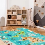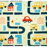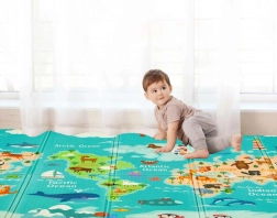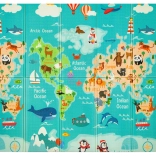 Design wspiera naukę przez zabawę: mapa świata z oceanami, kontynentami i zwierzętami wzbudza dziecięcą ciekawość geografią, natomiast uliczki z autkami i budynkami pobudzają wyobraźnię i kreatywną zabawę. Mata jest wodoodporna i higieniczna – wystarczy przetrzeć wilgotną ściereczką, nie pochłania kurzu i jest odpowiednia również dla alergików.