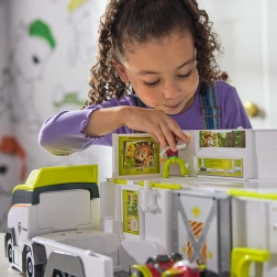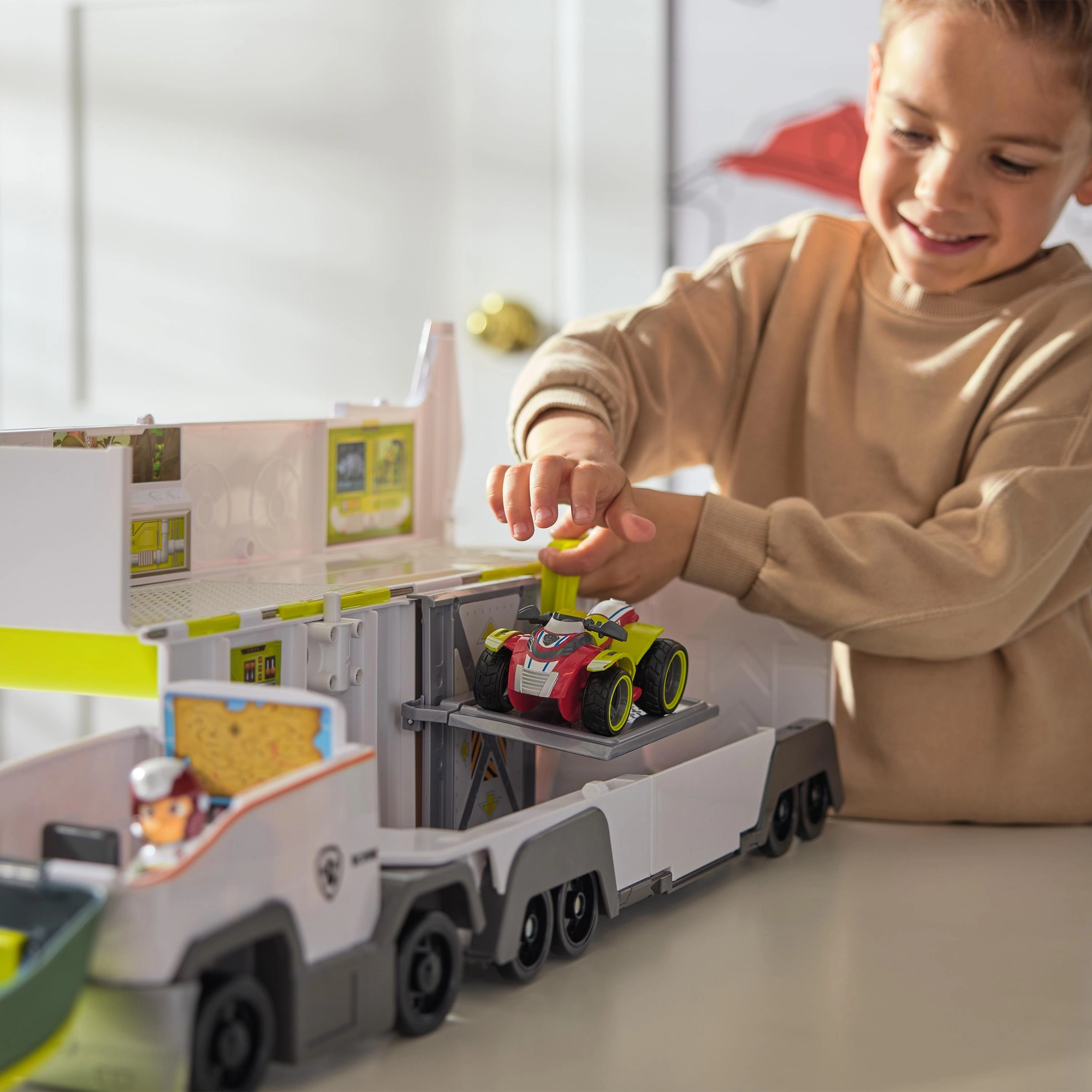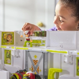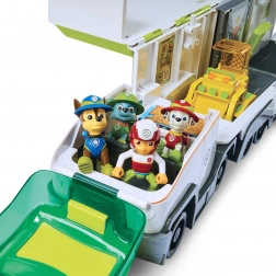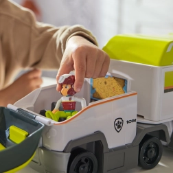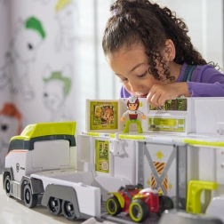 Transporter otwiera się, tworząc przestronną stację zabaw z panelami, rampami i miejscem na figurki oraz pojazdy. Idealny do szybkiego rozmieszczenia całej ekipy PAW Patrol.