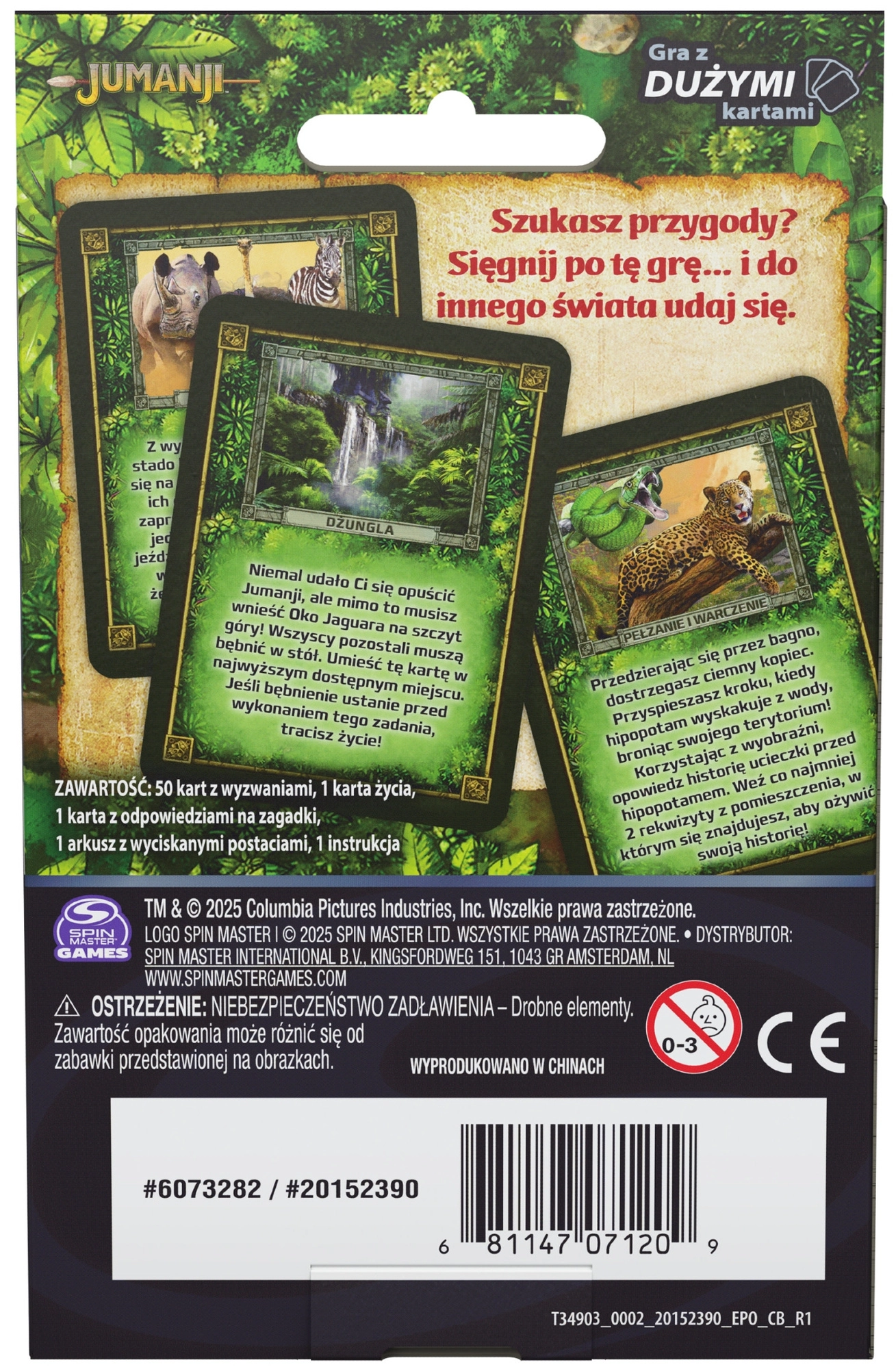 Rodzinna gra karciana JUMANJI wnosi emocje i przygodę do każdego wieczoru. Wybierz postać, odwróć kartę i zanurz się w nieoczekiwanych próbach dżungli. Duże karty z motywami dzikich zwierząt i atmosferą legendarnej gry przyciągną twoją uwagę od pierwszej do ostatniej minuty.