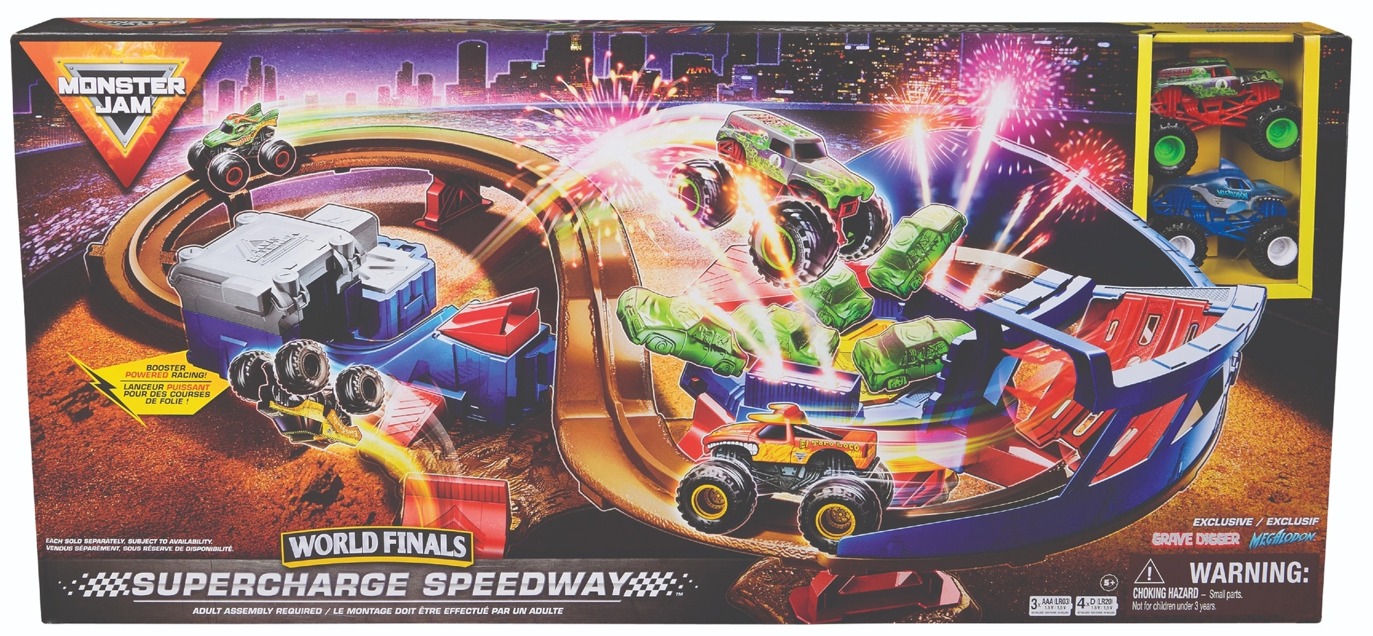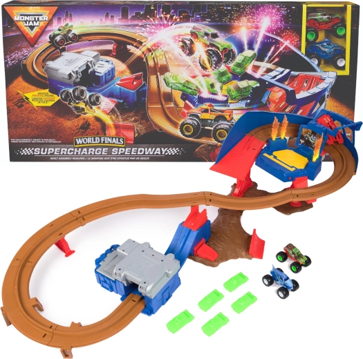 Zestaw MONSTER JAM Supercharge Speedway zamienia stół lub podłogę w arenę pełną adrenaliny. Ręcznie obsługiwana wyrzutnia rozpędza trucki do wysokich prędkości, a podwyższone odcinki, mostki i zakręty prowadzą prosto do oświetlonej strefy kraks dla efektownych zderzeń i lądowań. Po zakończeniu okrążenia pojazdy wracają na start – zabawa trwa bez przerwy.