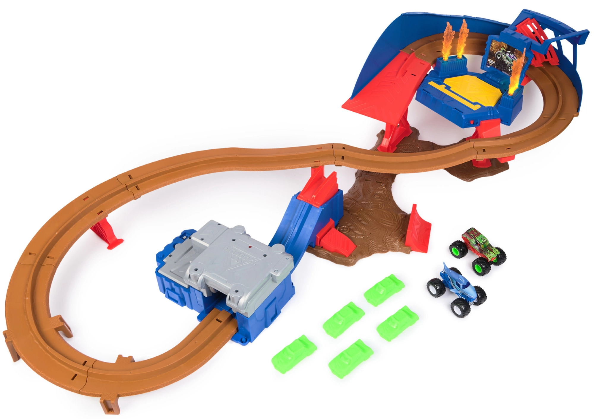 Montaż jest intuicyjny i solidny, z kolorowymi podporami i płomiennymi dekoracjami dla autentycznego klimatu show MONSTER JAM. Dzięki kompaktowemu składaniu zestaw łatwo przechować i błyskawicznie przygotować do kolejnego wyścigu.