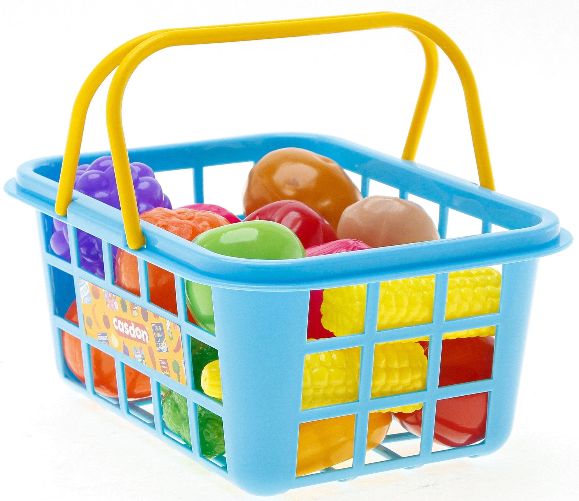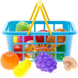 Dziecięcy koszyk na zakupy CASDON w niebieskim kolorze z żółtymi uchwytami jest wypełniony kolorowymi plastikowymi owocami i warzywami, co umożliwia realistyczną zabawę w sklep. Idealny do rozwijania wyobraźni, umiejętności społecznych i motoryki małej. W zestawie m.in. pomidor, ogórek, papryka, kukurydza, banan i winogrona. Wymiary koszyka są dopasowane do dziecięcych rąk i jest on bezpieczny dla dzieci od 2 lat. Świetny dodatek do innych zestawów sklepowych CASDON oraz do zabawy w zakupy.