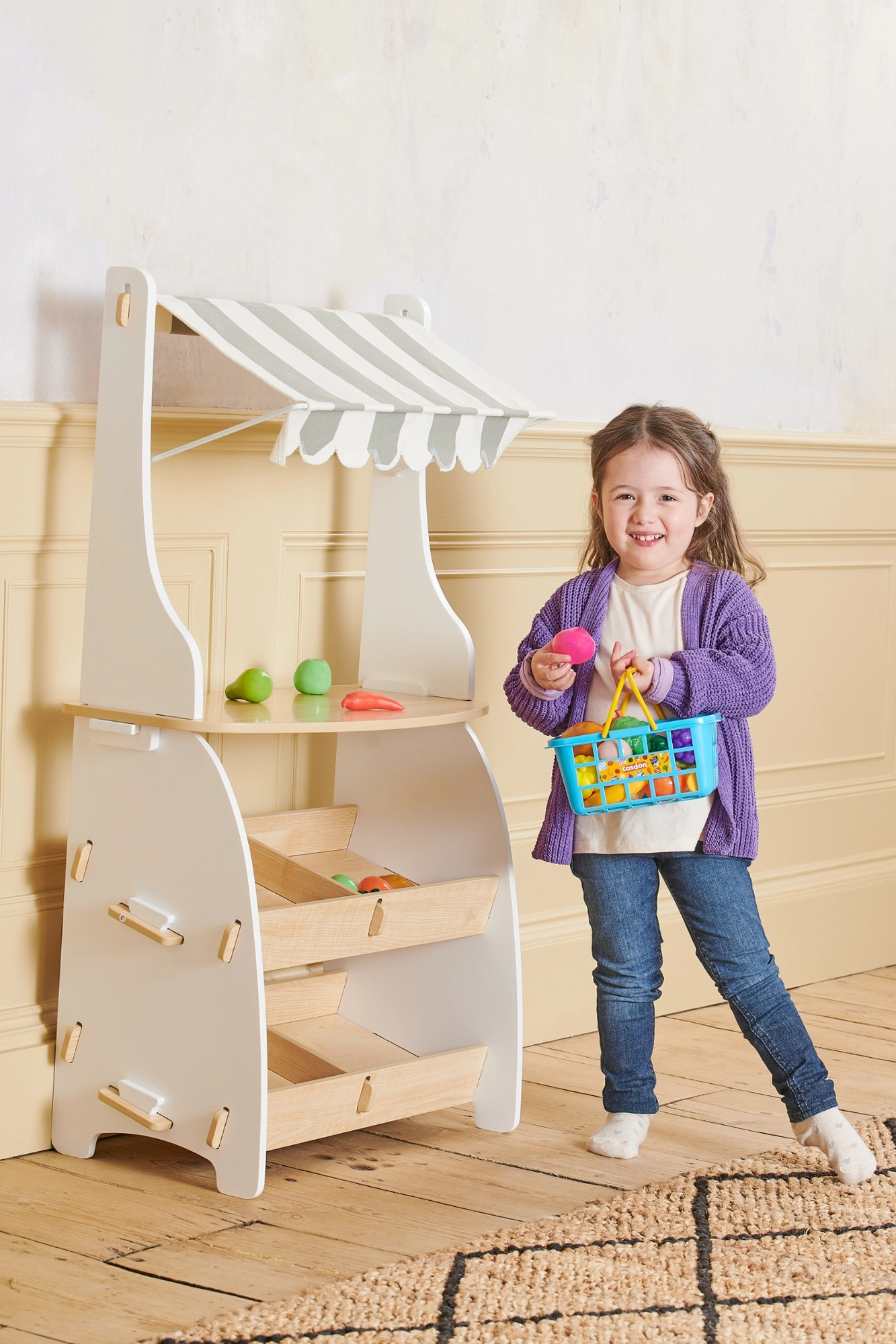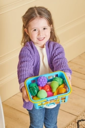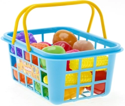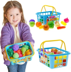 - Dziecięcy koszyk na zakupy z plastikowymi owocami i warzywami