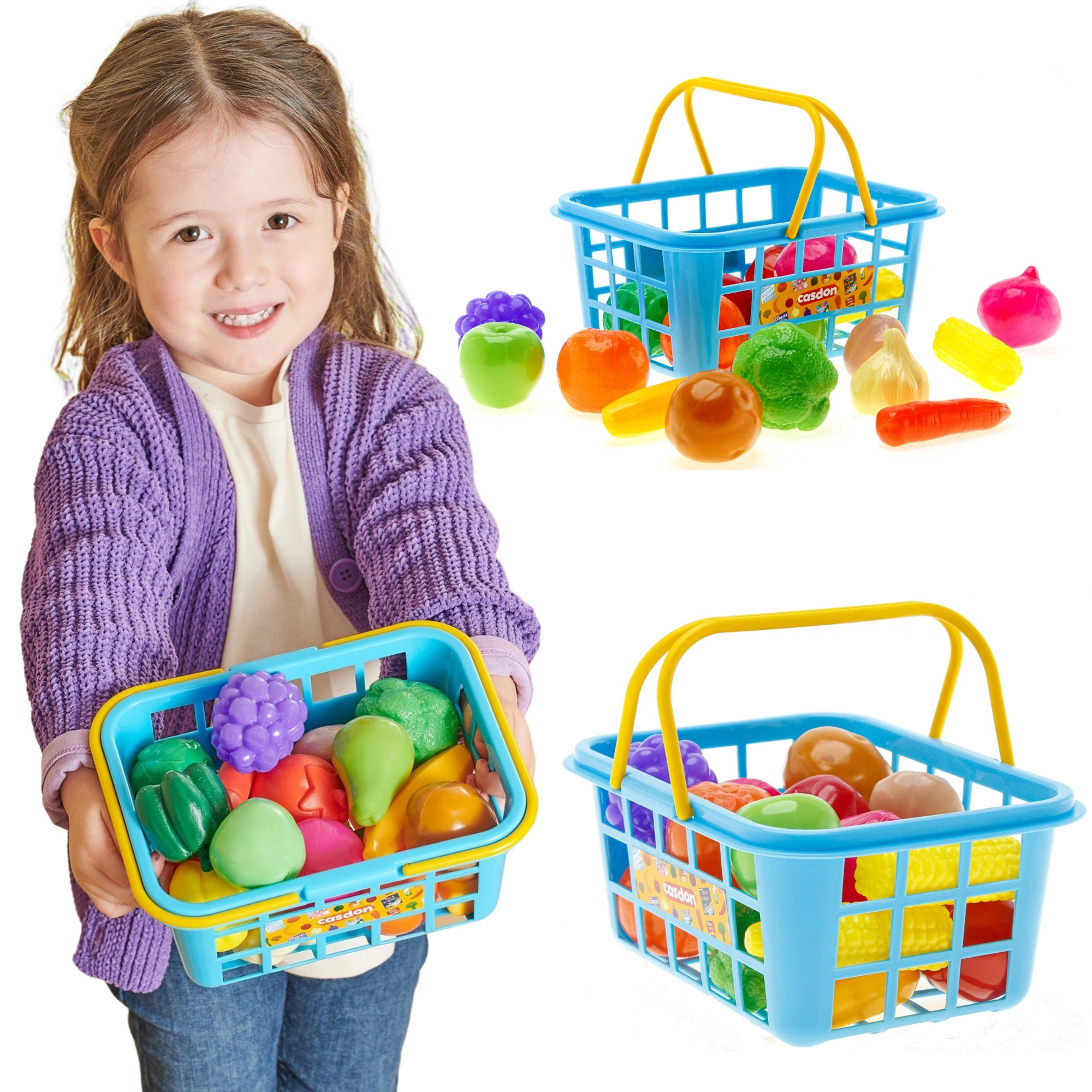 Realistyczna zabawa w sklep z koszykiem CASDON dostarcza dzieciom mnóstwo frajdy i nauki. Lekki koszyk w niebieskim kolorze z żółtymi, składanymi uchwytami łatwo się nosi, a dzięki wielu kolorowym produktom pobudza wyobraźnię i komunikację.