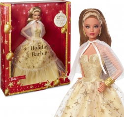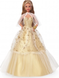 Elegancka kolekcjonerska lalka BARBIE na 35. rocznicę w satynowej sukni w odcieniu szampana z tiulową spódnicą usianą złotymi gwiazdami. Dopełnieniem są plisowana, półprzezroczysta peleryna, złota biżuteria oraz precyzyjne detale makijażu i manicure. Idealny prezent świąteczny i klejnot każdej kolekcji.