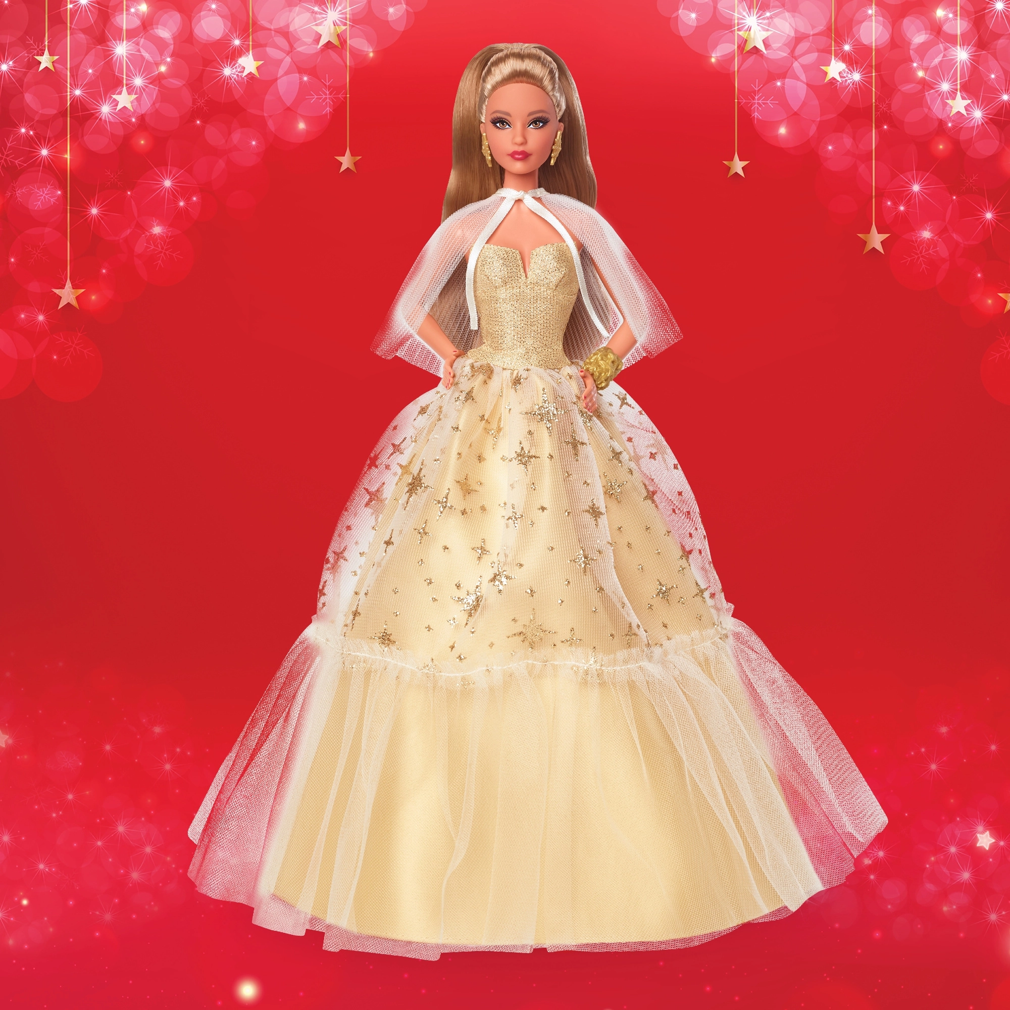 Strój tworzy satynowa suknia w kolorze szampana z tiulową spódnicą ze złotymi gwiazdami, do której pasuje plisowana, półprzezroczysta peleryna przewiązana satynową wstążką w kolorze kości słoniowej. Eleganckie opakowanie czyni z niej idealny prezent na Boże Narodzenie 2023 i wspaniały element do witryny.