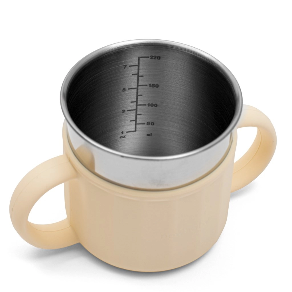 Odkryj stylowy i funkcjonalny kubek 2w1 NEW BABY, który rośnie wraz z Twoim dzieckiem. Połączenie 50% miękkiego silikonu i 50% stali nierdzewnej zapewnia trwałość, higienę i łatwe czyszczenie. Dzięki dwóm bocznym uszkom kubek świetnie leży w dłoni nawet najmłodszym, a stonowany beżowy design pasuje do każdego wnętrza.