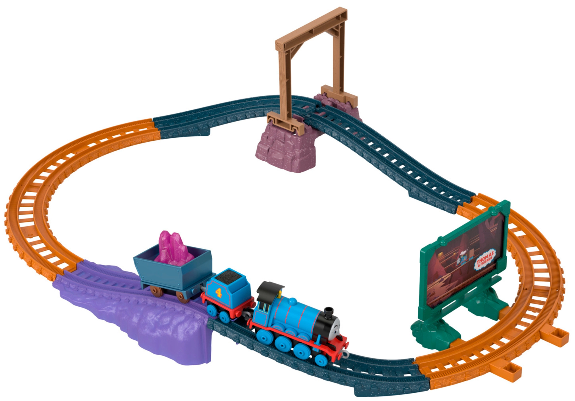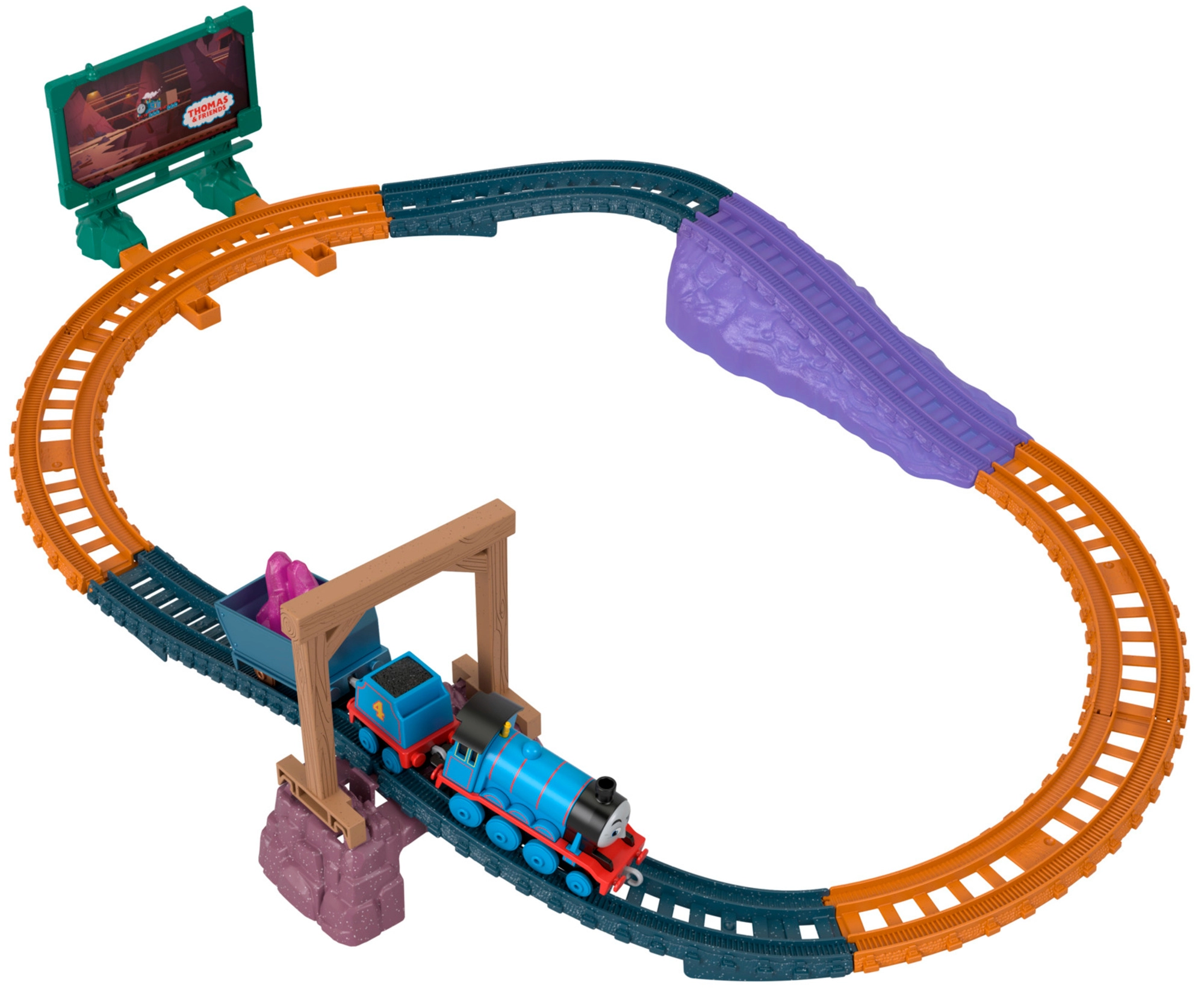Owalne tory z mostem, rampą tunelową i billboardem tworzą dynamiczne środowisko do zabawy i opowieści z kopalni.