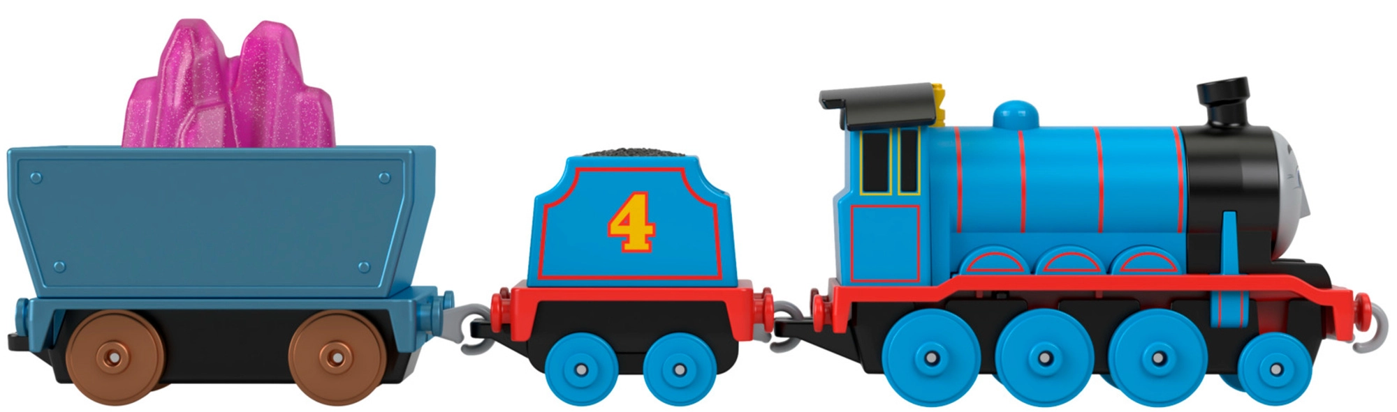 W zestawie znajduje się niebieska lokomotywa z tendrem, odkryty wagon oraz ładunek kryształów do realistycznego przewożenia surowców po torze.
