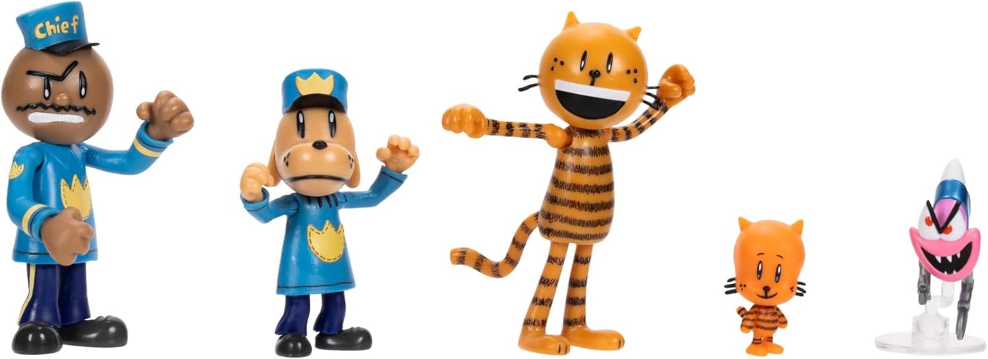 Komplet zawiera pięć ikonicznych postaci: Chief, Dog Man, Petey, Lil’ Petey i Flippy. Dzięki połączeniu bohaterów i czarnego charakteru dzieci z łatwością stworzą emocjonujące sceny i rozwiną wyobraźnię oraz opowiadanie historii.
