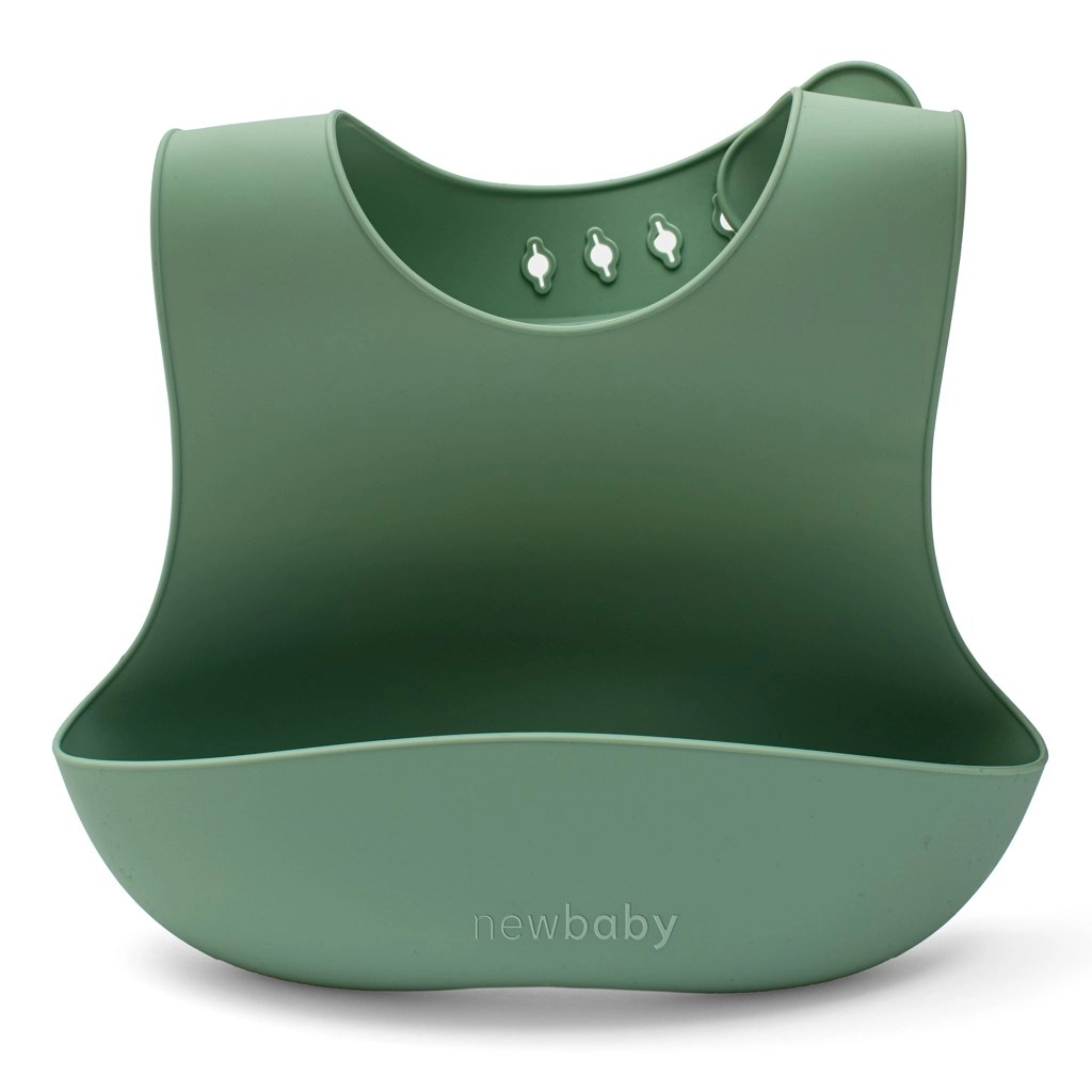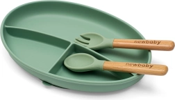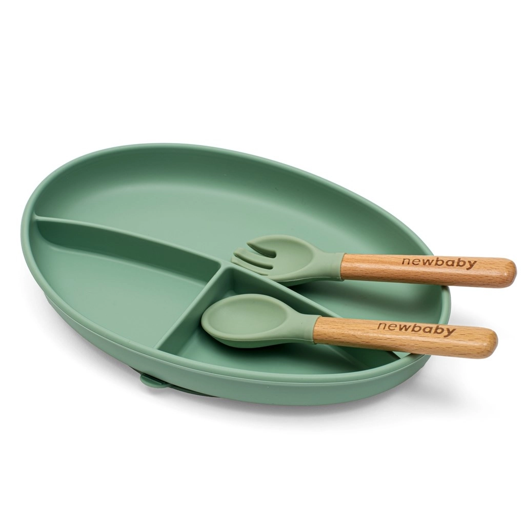 Zestaw NEW BABY w eleganckim zielonym kolorze został zaprojektowany dla wygodnego i czystego karmienia oraz samodzielnego jedzenia maluchów. Talerz z trzema przegródkami utrzymuje potrawy oddzielone, miska z przyssawką jest idealna do kaszek i zup, a regulowany śliniak z kieszenią chroni ubranie. Ergonomiczna łyżeczka i widelec z drewnianą rączką świetnie leżą w małych rączkach.
