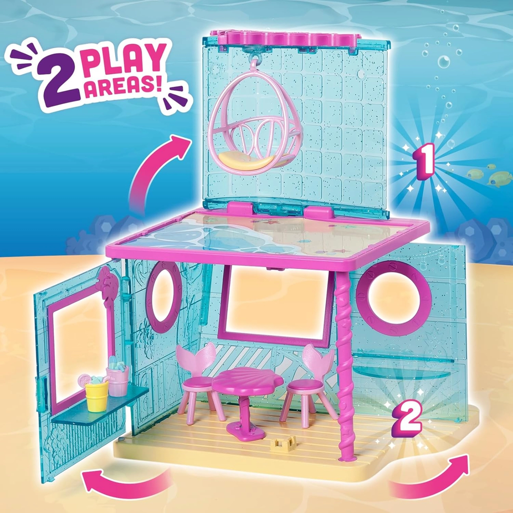 Wejdź do podwodnego świata z KookyLoos MERMAID – uroczą syrenką Shelly, która ma ruchome stawy, 3 wyrazy twarzy oraz efektowny błyszczący ogon. Otwórz plażowy domeczek dla syren, udekoruj go po swojemu i przeżywaj nieskończone historie z wiernym towarzyszem – delfinkiem.