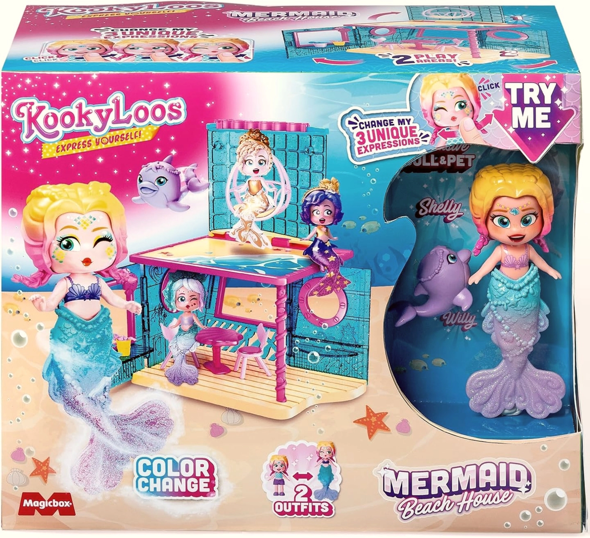 Odkryj magiczny świat KookyLoos z figurką Shelly i jej plażowym domeczkiem dla syren. Ten zabawny zestaw oferuje zmianę koloru w wodzie, 3 miny twarzy na jedno kliknięcie oraz mnóstwo modnych akcesoriów do kreatywnego mix & match. Idealny prezent dla dzieci, które kochają fantazję, kolekcjonowanie i styl.
