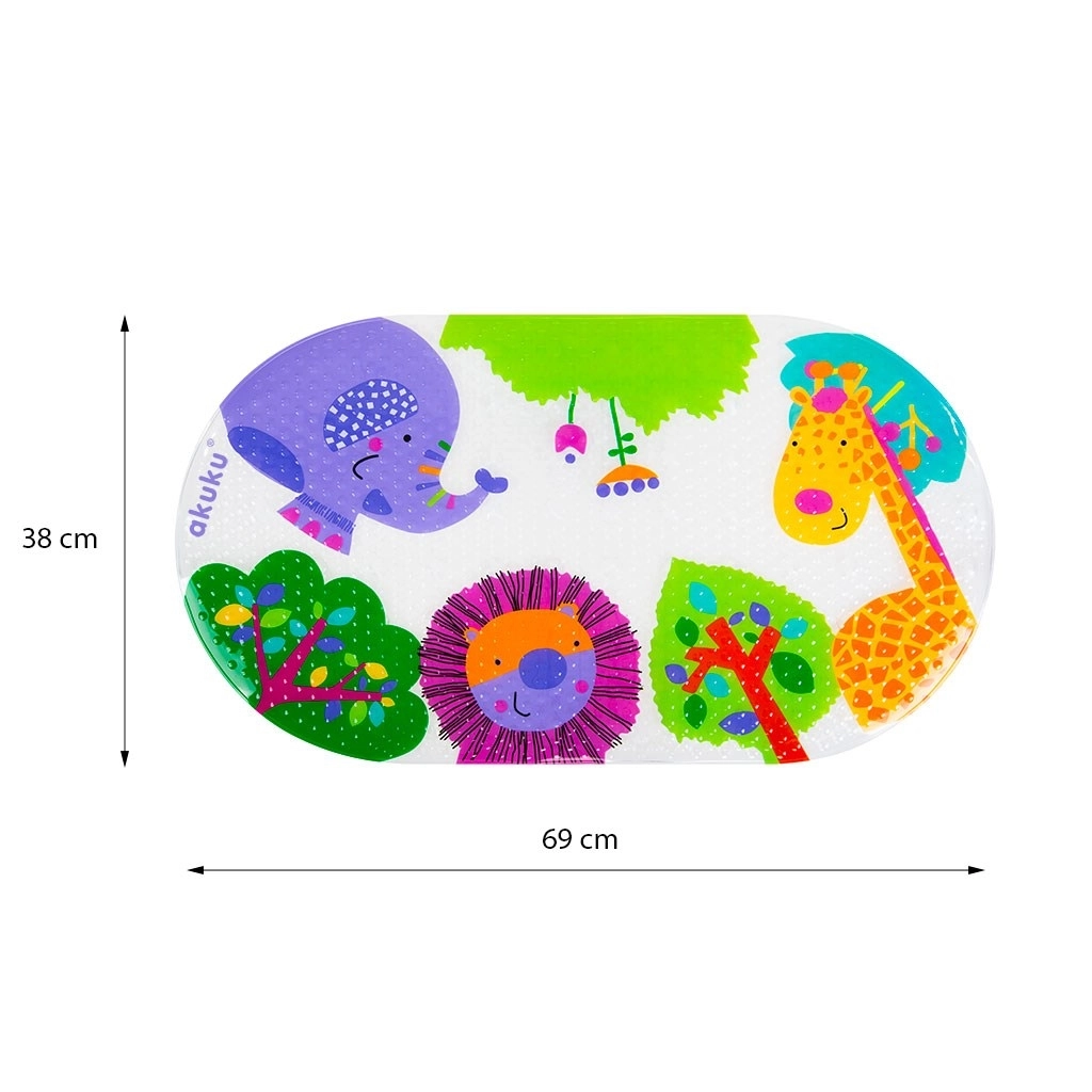 Mata Akuku została zaprojektowana do wanienek dziecięcych, klasycznych wanien oraz kabin prysznicowych. Dziesiątki przyssawek na spodzie trzymają się mocno gładkiej powierzchni, a strukturyzowana faktura pomaga zapobiegać poślizgnięciu. Materiał z wysokiej jakości PVC nie zawiera ftalanów i jest przyjemnie elastyczny.
